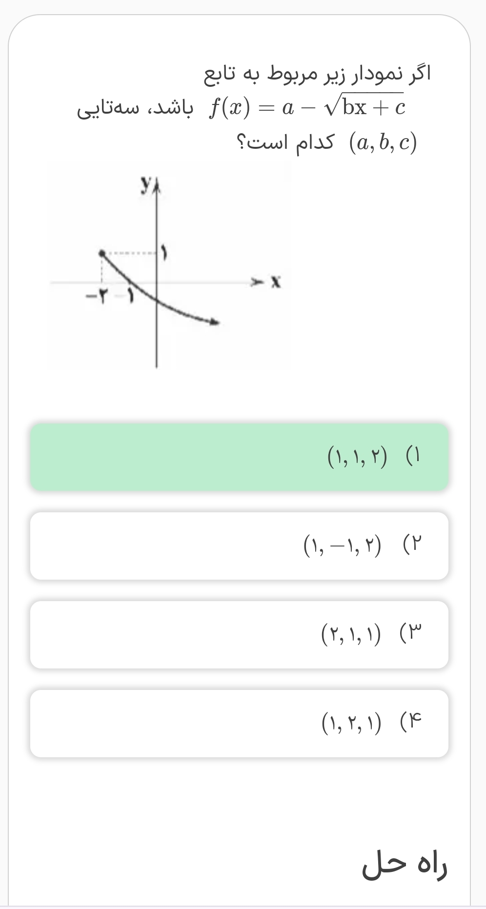 سلام . a که مقدار جا به جایی قائم هست پس میشه 1 . پس گزینه3 حذف . توی تابع نقطه شروع رو زده منفی دو ، پس ریشه زیر رادیکال باید بشه منفی دو . جای ایکس منفی دوبذاریم میشه 2b+c=0- ساده کنیم میشه 2b=c تنها گزینه ای که c دوبرابر b هست گزینه اول هستش . حالا من بیشتر گزینه ای حل کردم ولی مفهومش هم همینطوریه اگه بخوای کامل بری راه حل رو