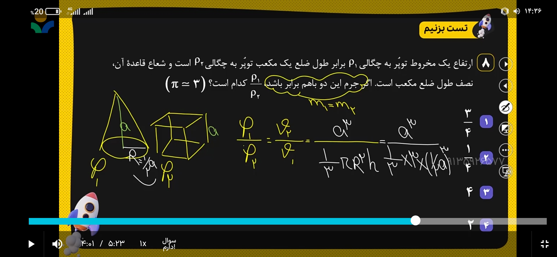 سلام. توی این سوال نباید مخروط رو ۱ در نظر گرفت؟ چون رُو۱ رو برای مخروط داده. در نهایت هم جواب یک چهارم به دست میاد.