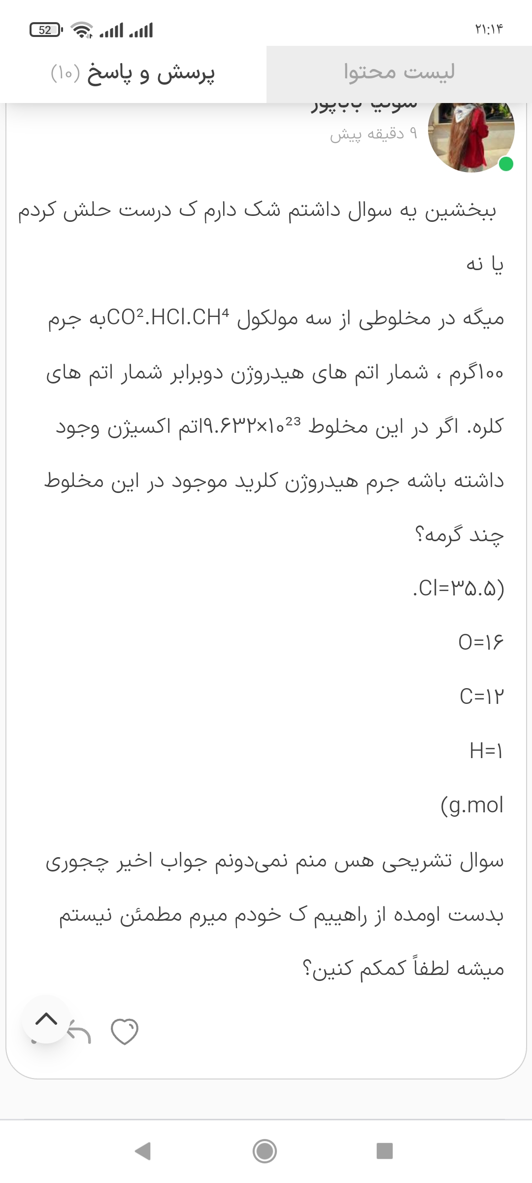 ببخشین یه سوال داشتم شک دارم ک درست حلش کردم یا نه میگه در مخلوطی از سه مولکول CO².HCl.CH⁴به جرم 100گرم ، شمار اتم های هیدروژن دوبرابر شمار اتم های کلره. اگر در این مخلوط 10²³×9.632اتم اکسیژن وجود داشته باشه جرم هیدروژن کلرید موجود در این مخلوط چند گرمه؟ (35.5=Cl. 16=O 12=C 1=H g.mol) سوال تشریحی هس منم نمیدونم جواب اخیر چجوری بدست اومده از راهییم ک خودم میرم مطمئن نیستم میشه لطفاً کمکم کنین؟