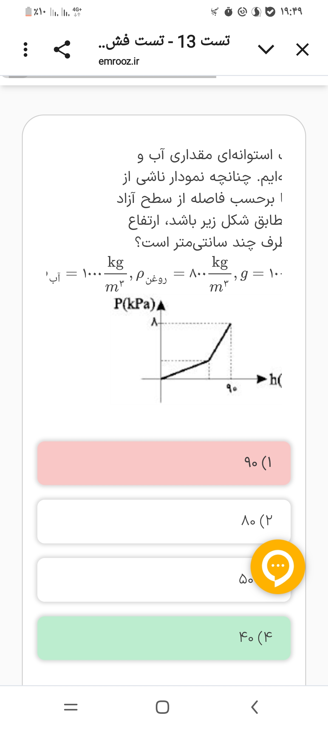 سلام جواب چی یاد گرفتی میشود گزینه ۴ دلیل : چون که هیچ فشار ناشی از مایعات به شکل ظرف و سطح مقطع بستگی ندارد بلکه به جنس مایع و ارتفاع از سطح آزاد مایع بستگی دارد .