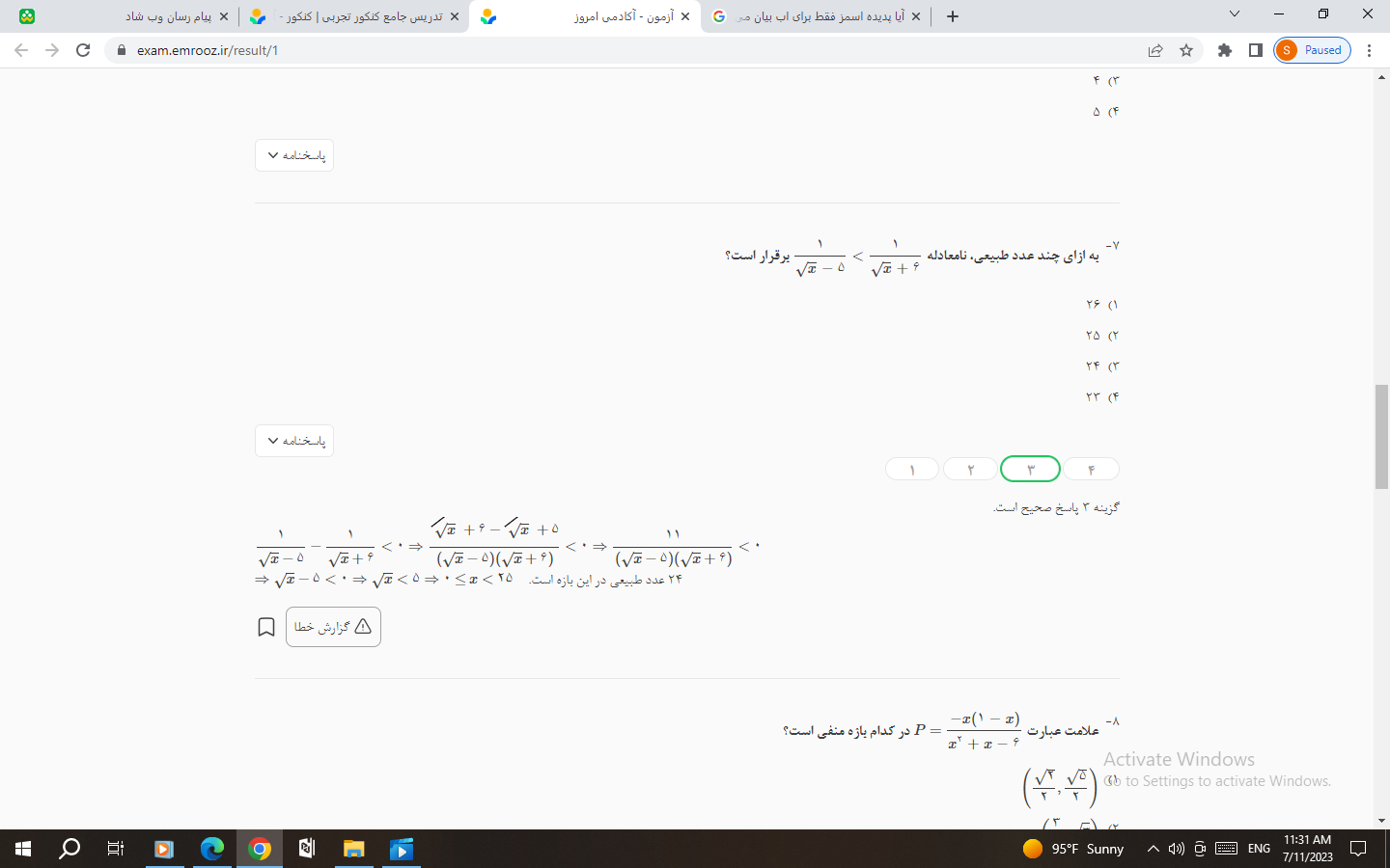 سلام این یکی از سوالات آزمون هست که من درش مشکل دارم.(البته نمی دونم رفع اشکال ازمون هم میتونیم بپرسیم یا نه...) فقط قسمت اخرش را نمی فهمم اونجا که فقط رادیکال ایکس منهای پنج را تعیین علامت کرده.و اینکه وقتی رادیکال ایکس را کوچکتر از پنج نوشته چی شده که ایکس بین صفر تا بیست و پنج قرار گرفته؟