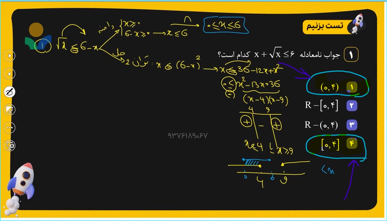 اونجایی که استاد X رو بردن سمت راست به جاش من x2 - 12X +36 رو بردم سمت چپ و ساده کردم اینطوری موقع تعیین علامت من باید کمتر مساوی 0 رو در نظر بگیرم ولی استاد بزرگتر مساوی 0 رو در نظر گرفتن. چرا فرق میکنه؟