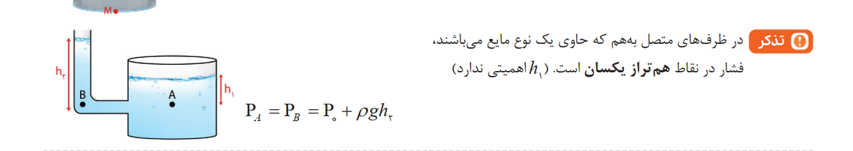 سلام. نقطۀ D , C هیچکدوم سطح آزاد مایع ندارن! یعنی از طرف دیوارۀ بالای لوله هاشون به مایع داخل ظرف، نیرو وارد میشه! بنبابر این هر دو نقطۀ هم سطح در یک نوع مایع، فارغ از شکل لوله ای که در اون قرار دارن باید یک فشار داشته باشن! اینطور نیست؟