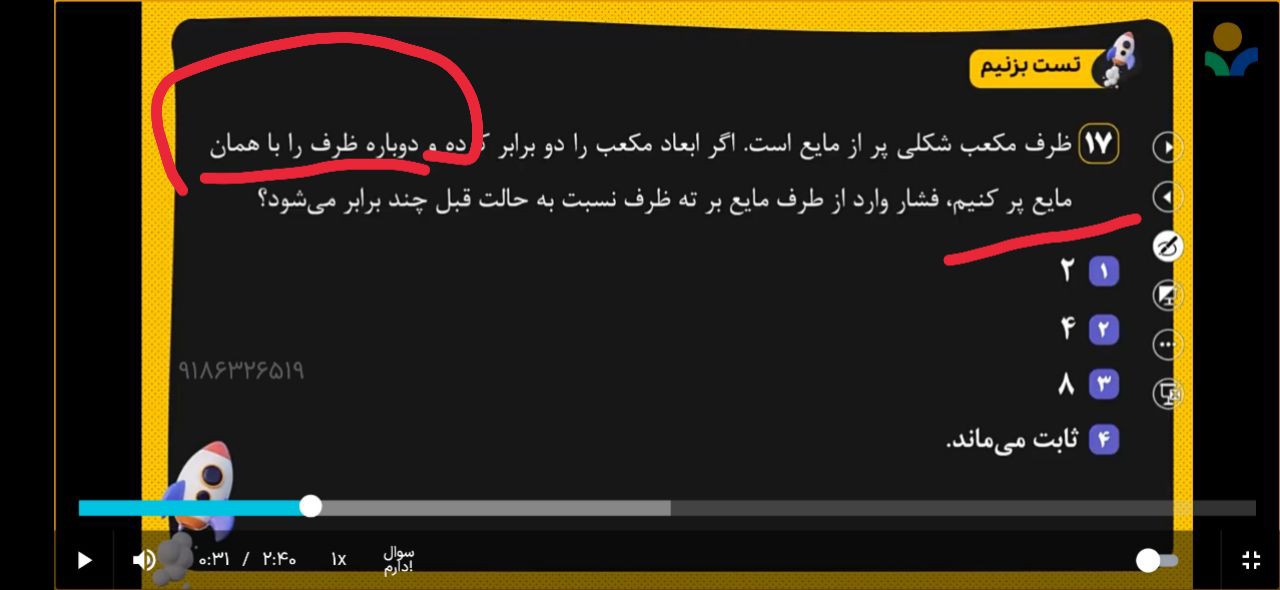 من برام سواله که خوب حجم مایع که دوبرابر شده خوب حجم مکعب هم دوبرابر شده پس فشار تغییر نکرده دیگه برای من سواله که چطور اینجا فقط ارتفاع رو در نظر میگیریم