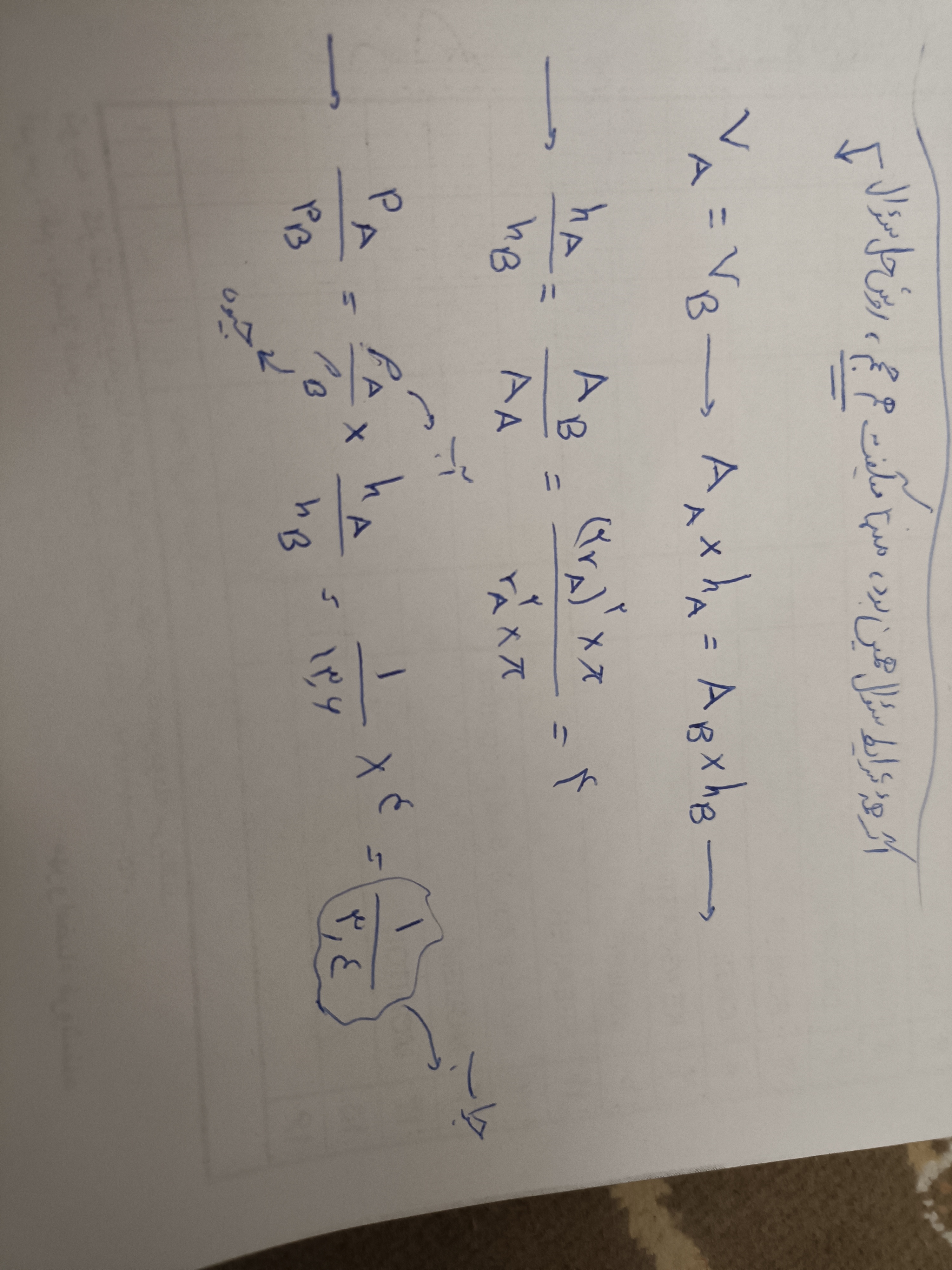سلام فشار رو از رابطه چگالی در شتاب در ارتفاع مایع میخاد بدست بیاره برای همین میخاد محاسبه کنه اگر هم جرم باشن، ارتفاع هاشون چقدر میشه ارتفاع ها رو بدست میاره و تو رابطه قرار میده