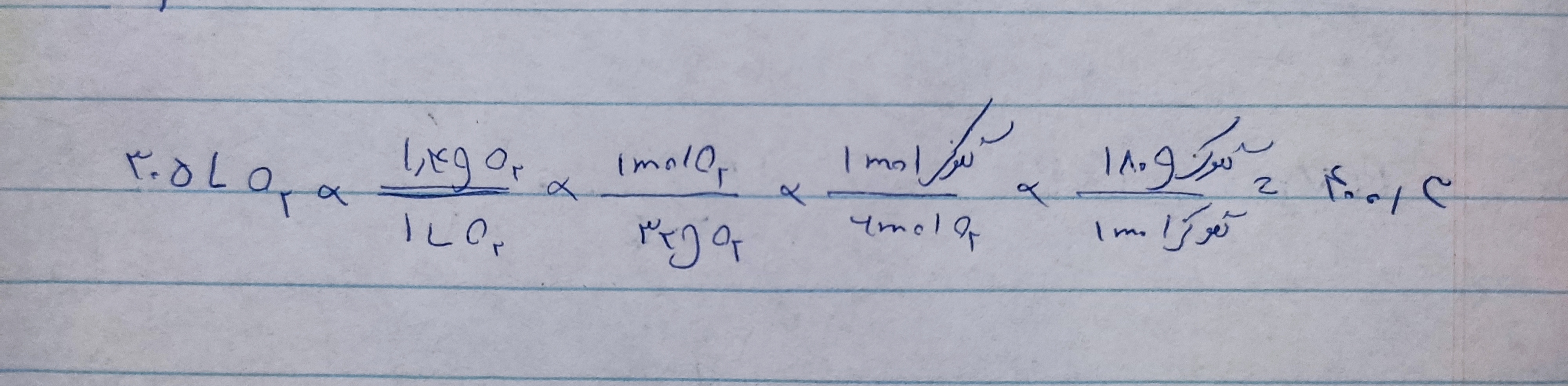 سلام برای محاسبه حجم گاز اکسیژن، در مخرج نباید ضریب را در جرم مولی ضرب کنیم؟