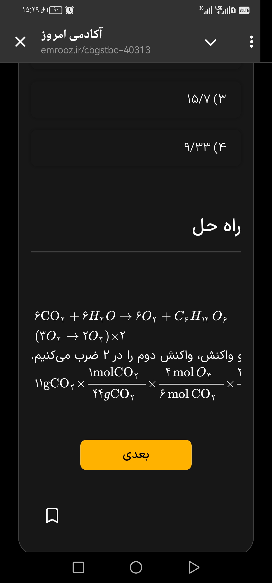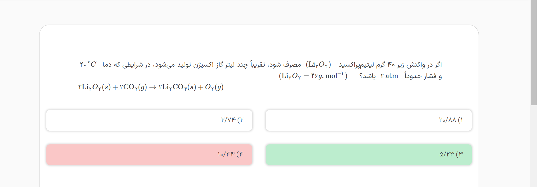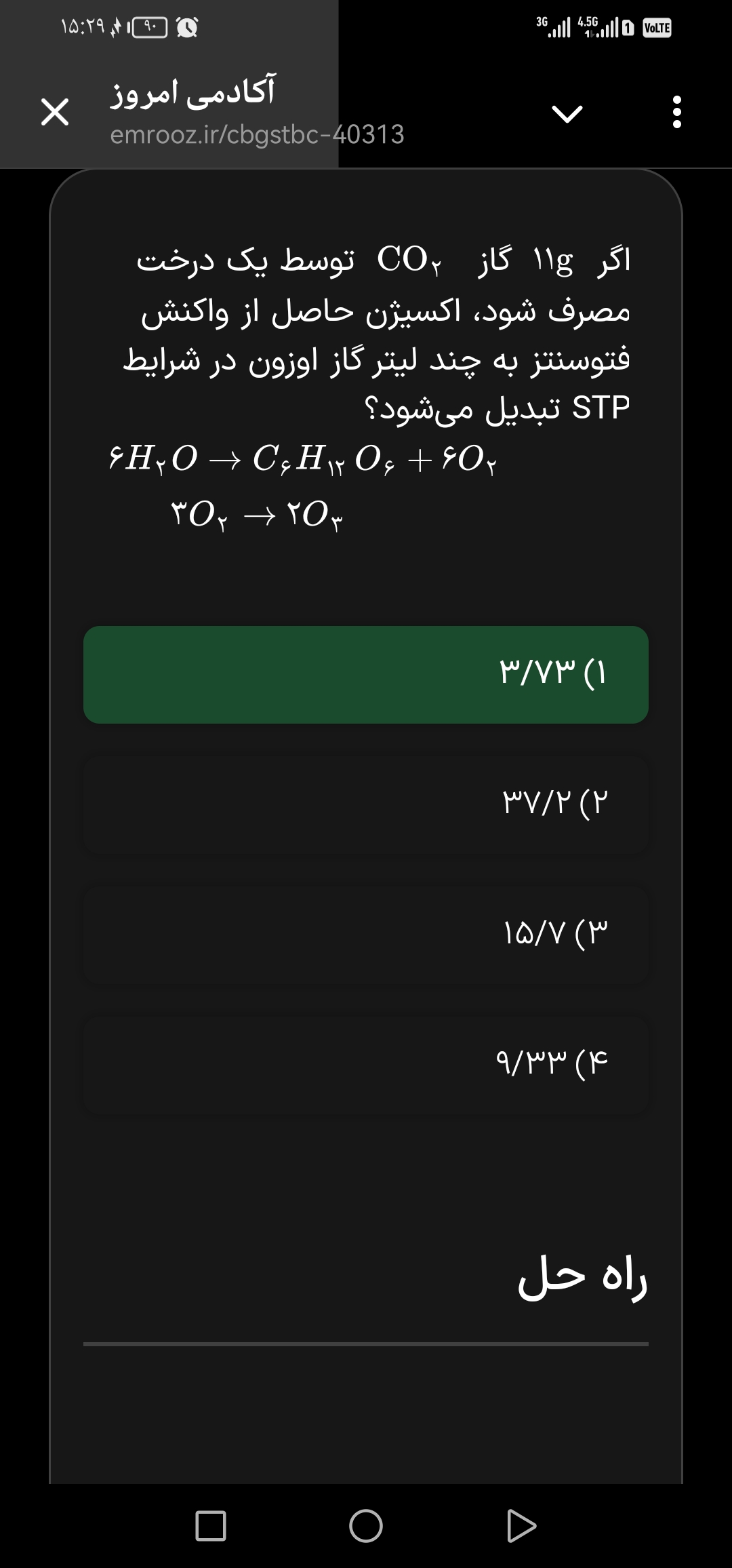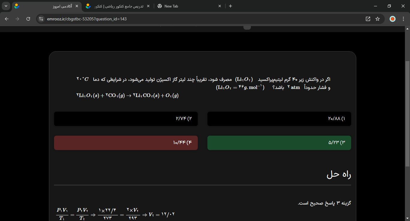 @طهورا عیوضی ببین در شرایط STP دربیار حجمشو بعد چون شرایط STP شرایطیه که توش دما صفر درجه سانتیگراد و فشار یک اتمسفر هست پس حجمی که تو شرایط STP بدست آوردی یبار تو فرمول P1V1=P2V2 قرار میدی و در فشار ۲ اتمسفر درمیاری و عددی که آوردی رو تو رابطه V1/T1=V2/T2 میزاری بعد جواب بدست میاد یا میتونی کلا یبار مثل پاسخنامه بزاری تو یه رابطه و جواب رو بیاری