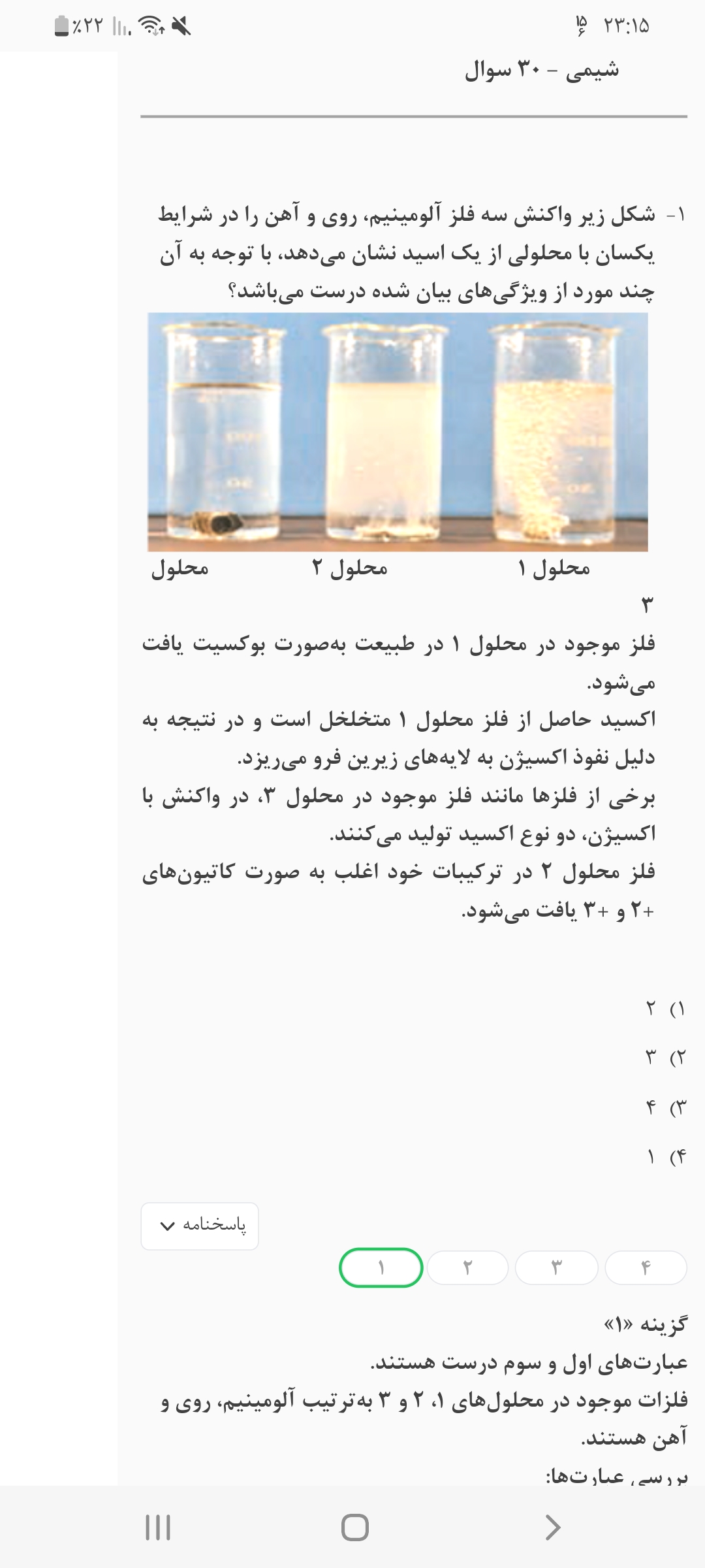 سلام این سوال توی آزمون فصل ۲ شیمی دهم طرح شده و شکلش اصلا تو کتاب درسی نیست و نمیدونم از کجا آوردن که مثلا بدونیم محلول ۱ توش آلومینیوم هست