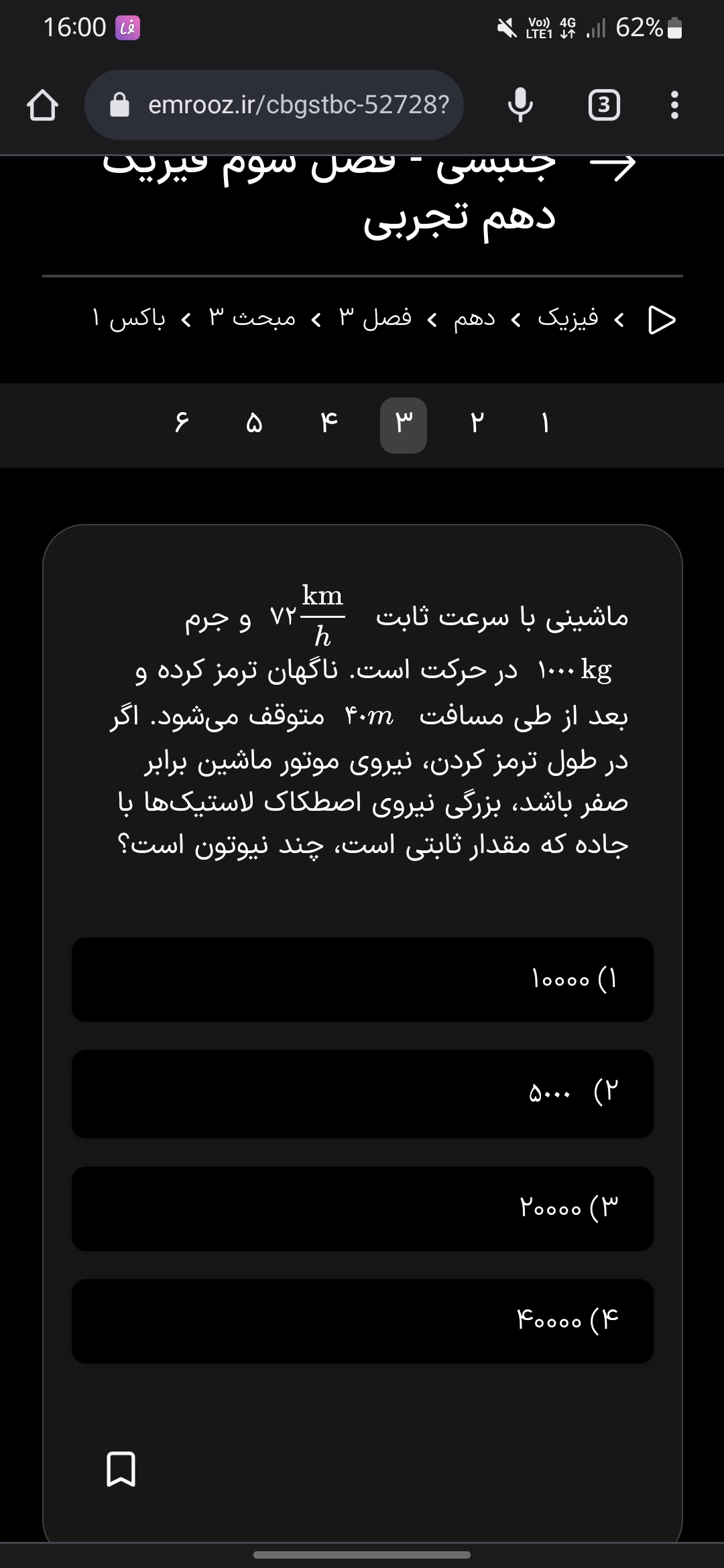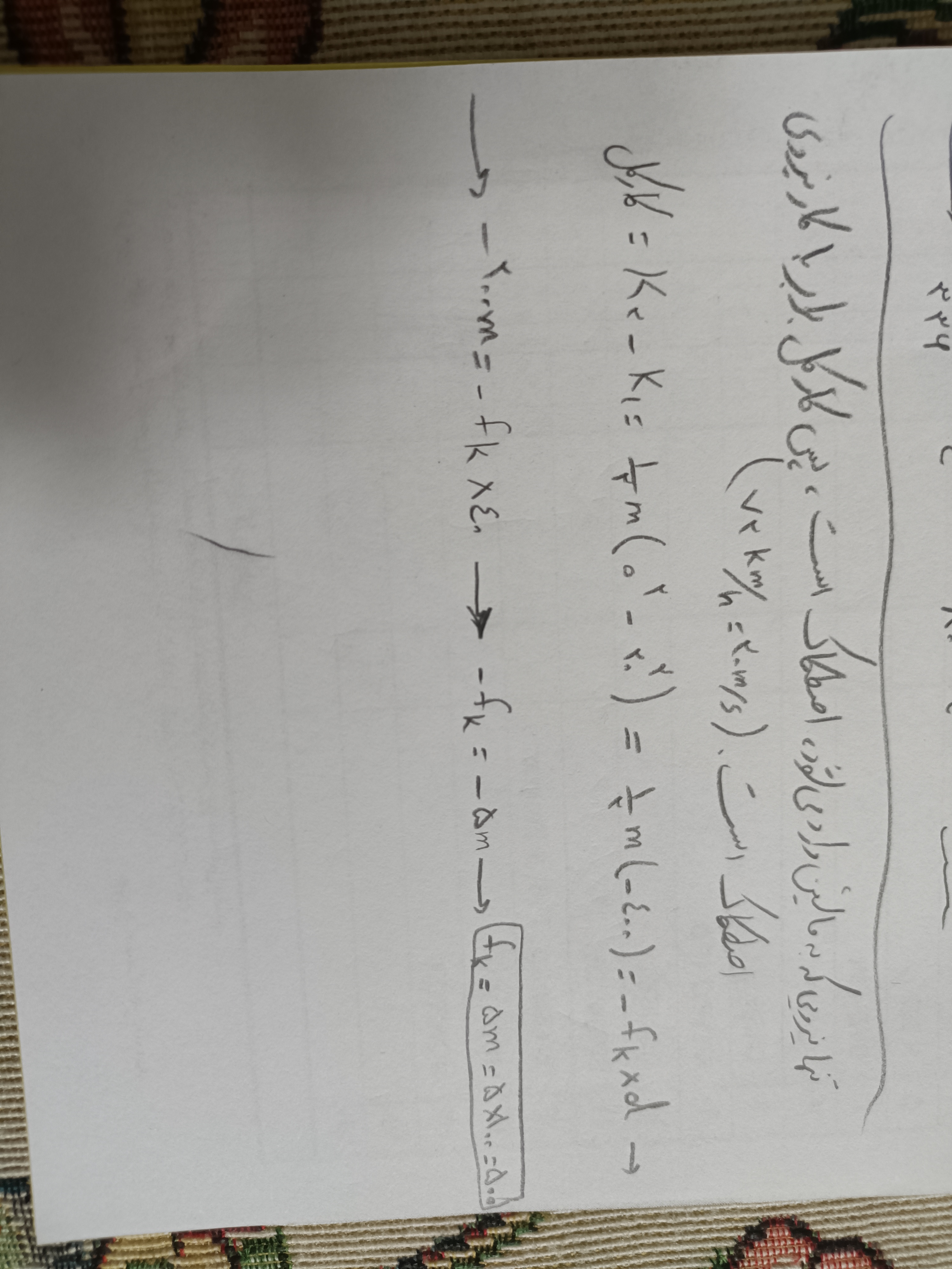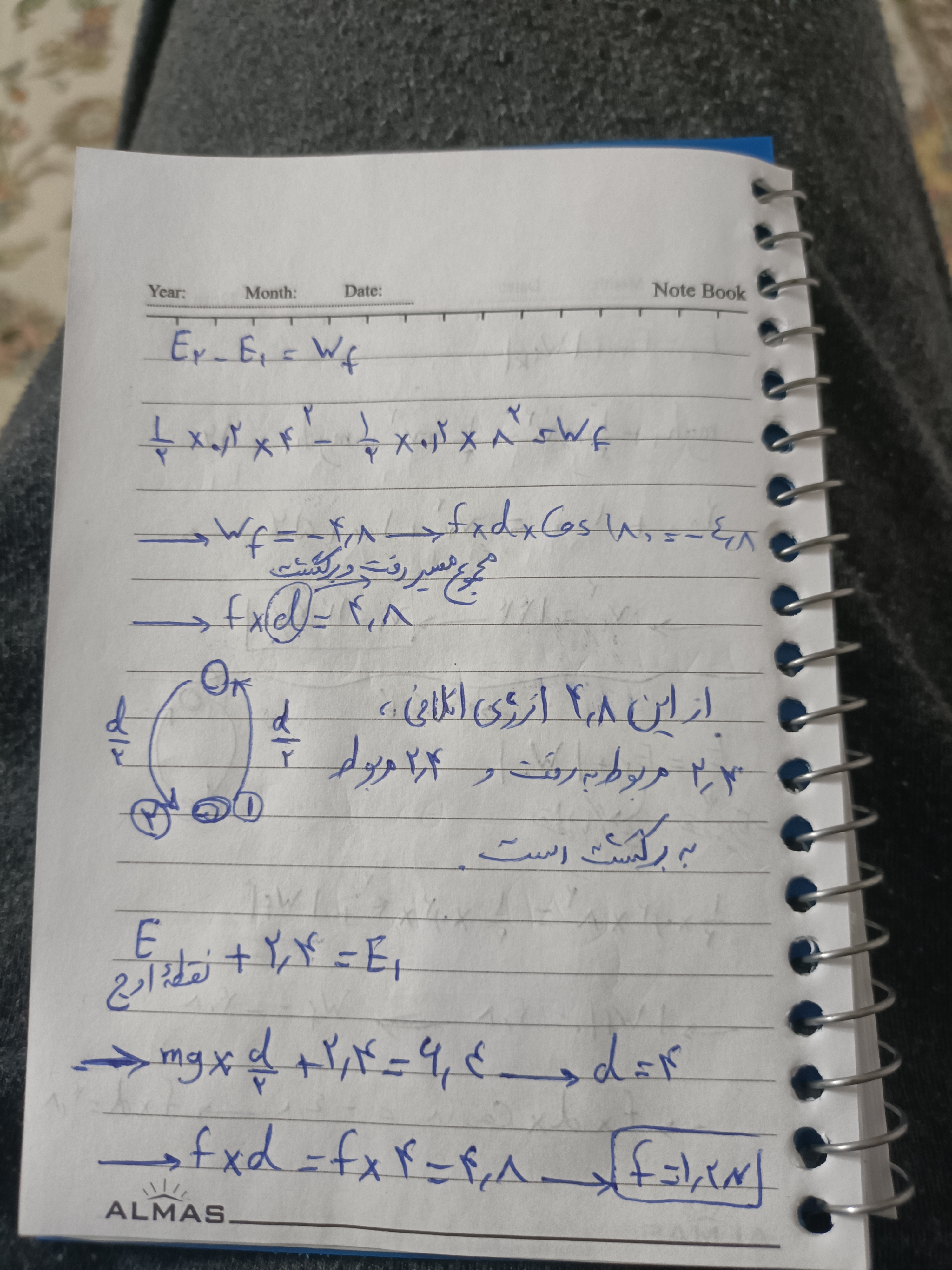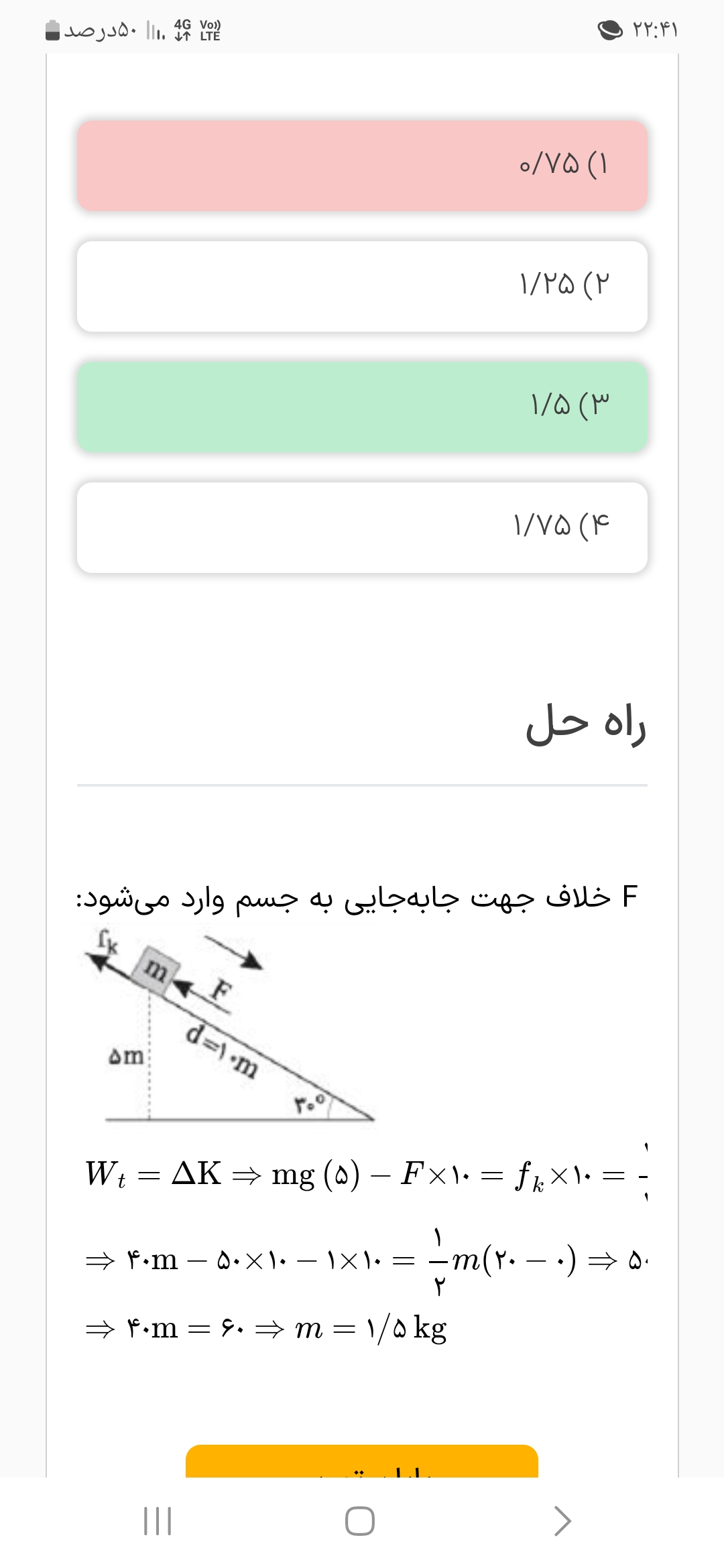 سلام لطفا یک عزیزی جواب بده چطوری 1.5شدهتمرین یادبگیریم1 فیزیک دهم فصل 3 مبحث 3 باکس 1 1 2 3 4 5 6 در شکل زیر جسم به جرم m‏ روی سطح شیب‌دار شروع به پایین آمدن می‌کند. اگر نیروی اصطکاک در مقابل حرکت جسم، ١N باشد و در انتهای مسیر تندی جسم به ۲۰−−√ms برسد، m‏ چند کیلوگرم است؟ (g=١۰Nkg) 1) ۵‏۷‏/۰‏ 2) ۵‏۲‏/۱‏ 3) ۵‏/۱‏ 4) ۵‏۷‏/۱‏ راه حل گزینه ۳‏ پاسخ صحیح است. با پایین آمدن جسم نیروی F‏ خلاف جهت جابه‌جایی به جسم وارد می‌شود: Wt=ΔK⇒mg(۵)−F×١۰=fk×١۰=١۲m(v۲۲−v۲١) ⇒۴۰m−۵۰×١۰−١×١۰=١۲m(۲۰−۰)⇒۵۰m−۶۰−١۲×m(۲۰) ⇒۴۰m=۶۰⇒m=١/۵kg پایان تمرین