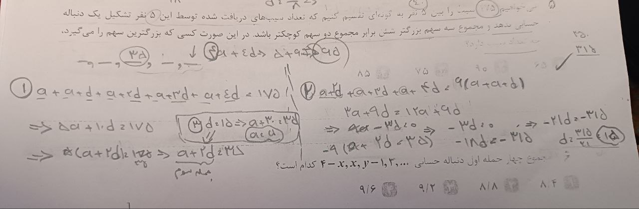 سلام عزیزم اگر اشتباه نکنم منظورت اینه چرا دنباله حسابی رو صعودی در نظر گرفتیم نه نزولی ببین اینجا فرقی نداره ما دنباله رو نزولی بگیریم یا صعودی چون فقط قید شده مجموع 3 سهم بزرگتر 6 برابر 2 سهم کوچیکتره حالا ممکنه اون 3 سهم 3 جمله اول دنباله باشن یا 3 جمله اخرش همچنین بزرگترین سهم هم میتونه یا جمله اول باشه یا جمله اخر مهم اینه جملات چی باشن