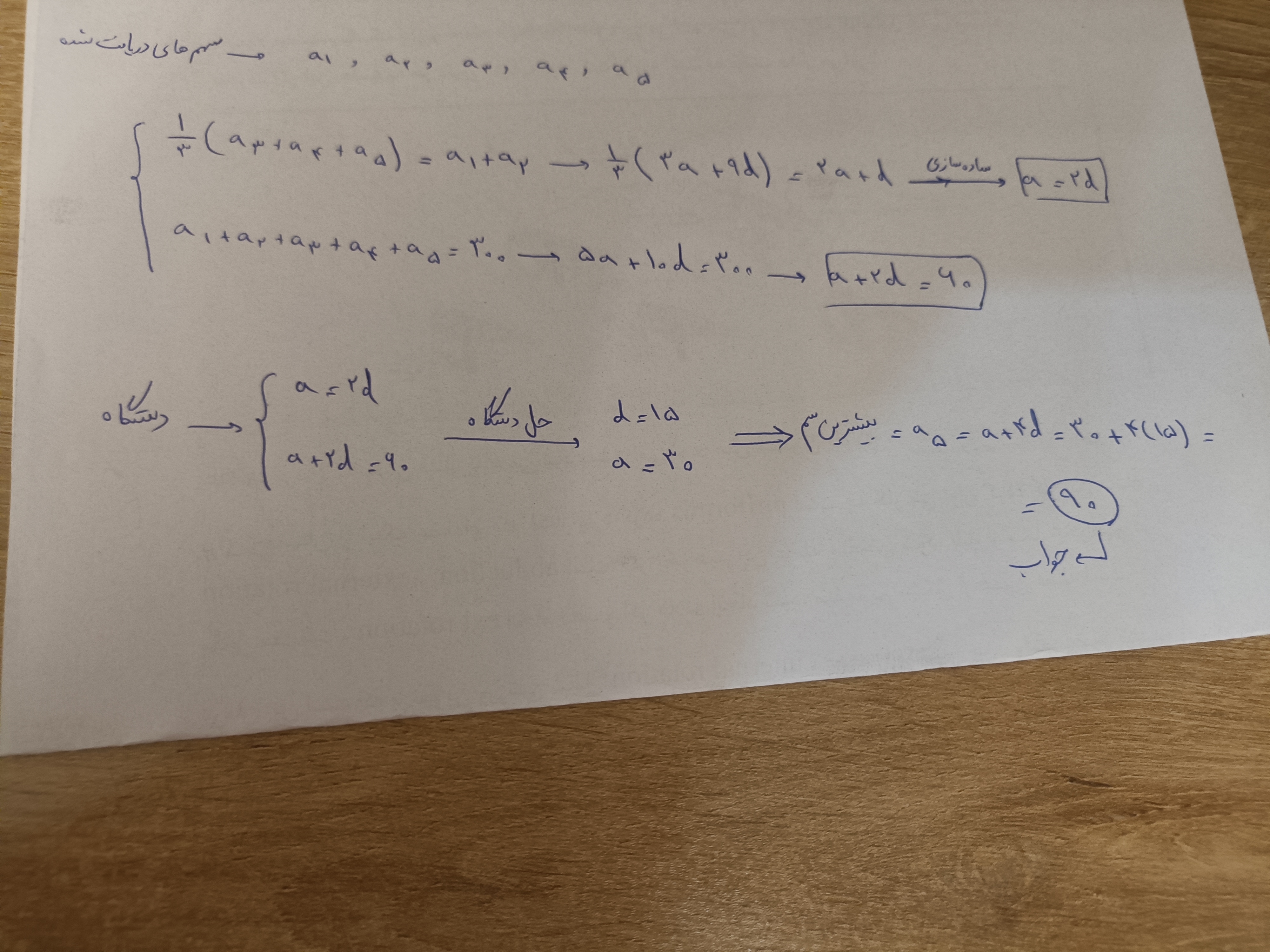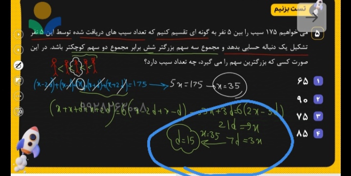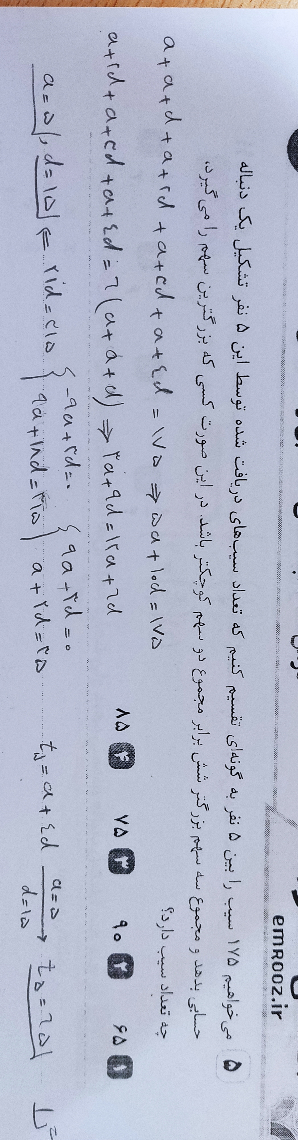 سلام ببخشید یک سوال دارم.نمیشه این رو از راه a1 + a2 + ... + a5 =175 حل کرد؟