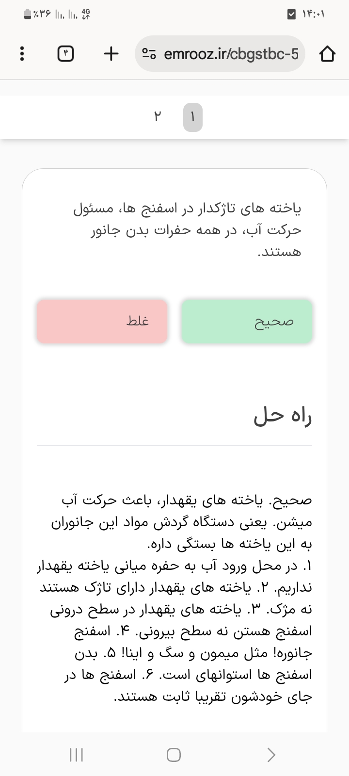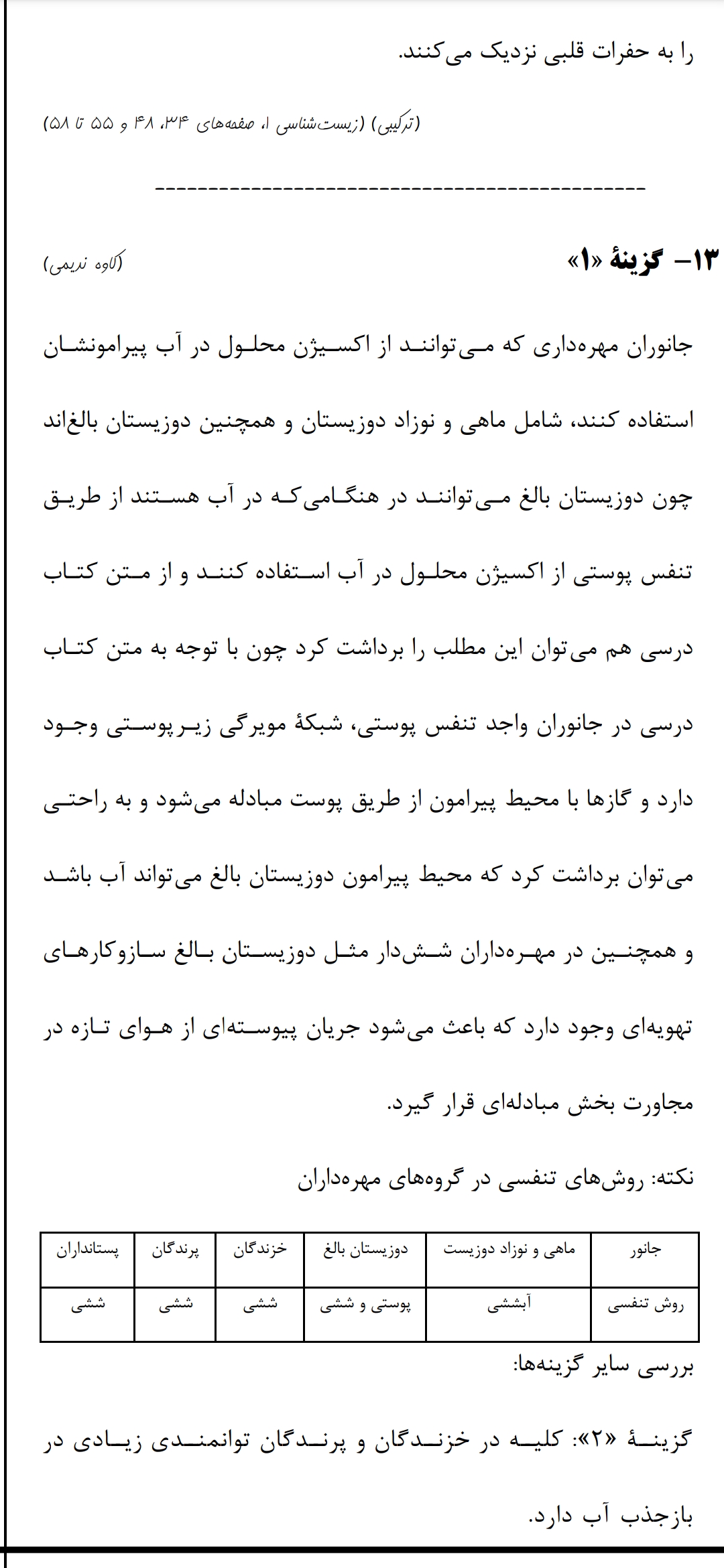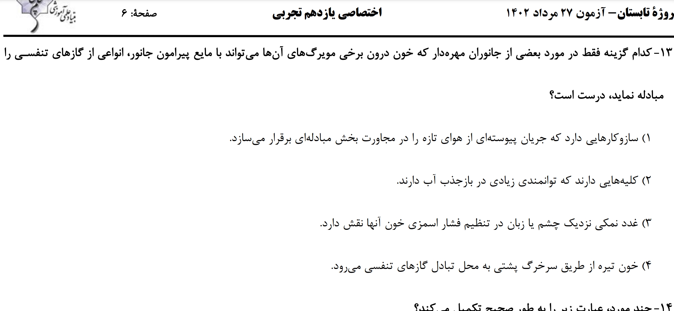 سلام ببخشید گزینه یک پاسخ درست هست چرا آخه؟ آخه توی آبشش داران وه جریان تازه ای از 《هوا》 که...