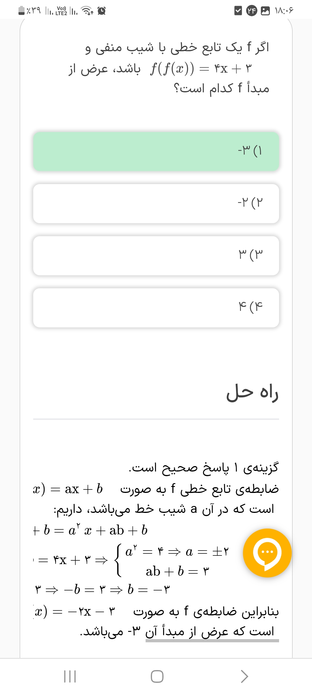 سلام میشه جواب این سئوال رو اینجوری حل کرد که نمودار معادله داده شده را رسم کنیم بعد عرض از مبدا آن رو قرینه کنیم؟