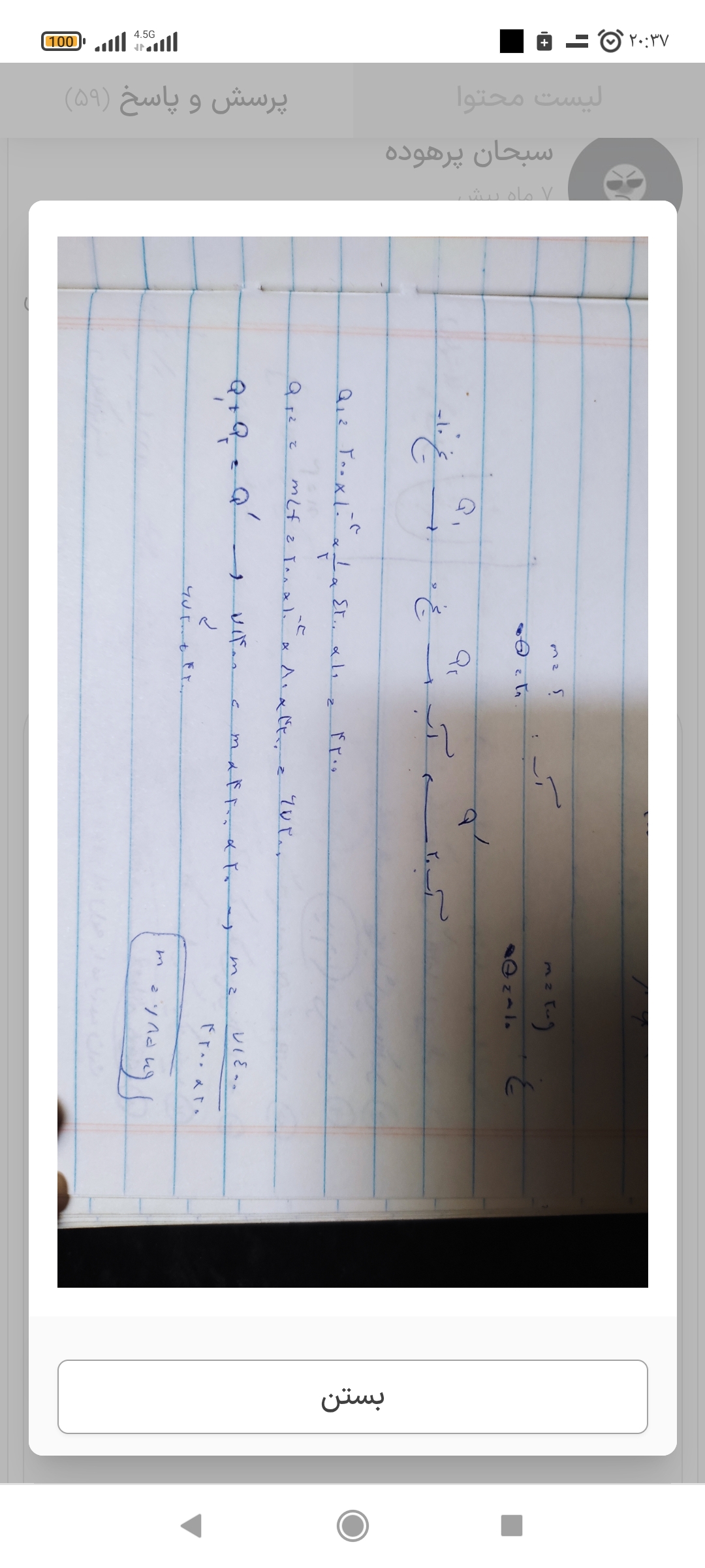 سلام وقتت بخیر باشه چون تصویر روش حل هست من توضیح میدم شاید بهتر متوجه بشی کیو و کیو پریم را مساوی هم میگذاریم چون گفته تموم یخ آب شده اگر از روش اول می رفتیم دو تا مجهول داریم پس از روس مساوی قرار دادن این دو میریم سمت کیو ، فرمول ام سی دلتا تتا قرار میدیم چون فقط تغییر دما داریم و سمت کیو پریم دوتا کیو هست یکی مربوط به تغییر دما یخ منفی ده درجه به یخ صفر درجه و کیو بعدی تغییر حالت یخ به آب جمع این دو کیو پریم مساوی با کیو قرار میدیم و جواب بدست میاد امیدوارم متوجه شده باشی