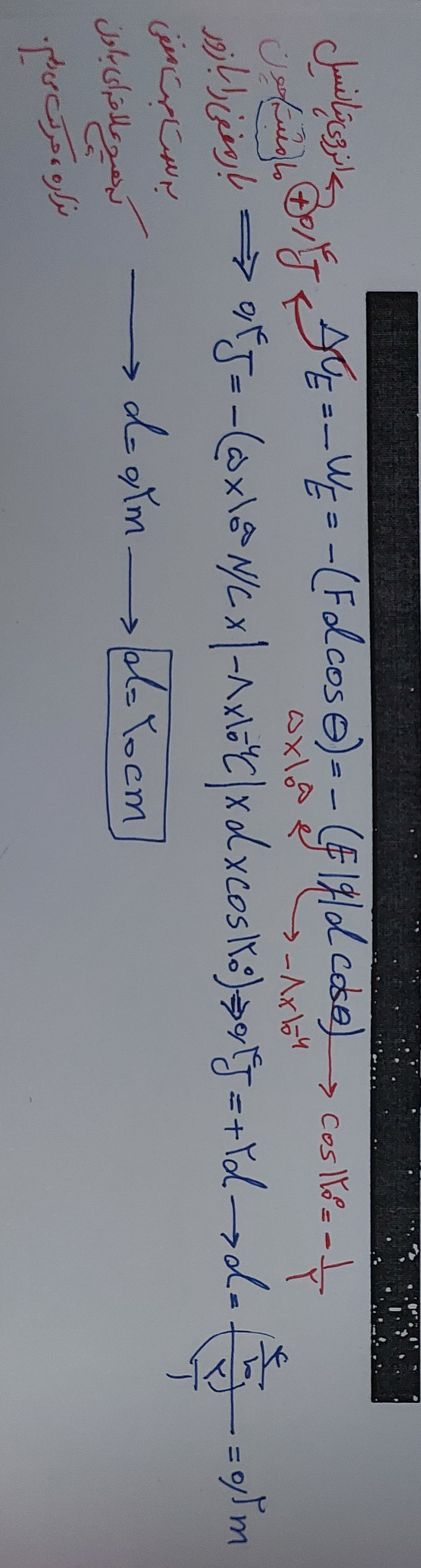 سلام وقت بخیر اگه بیاییم بردار جابه جای رو به عنوان بردار نیرو درنظر بگیریم و مثل زمانی باهاش برخورد کنیم که نیروی مایل داریم ، میتونیم اون رو به صورت بردار های x و y در نظر بگیریم. در اینصورت درجهت بردار y کاری انجام نمیشه و در جهت بردار x کار انجام میشه . حالا چون این بردار مجاور زاویه ۶۰ درجه است، میشه نصف وتر یعنی نصف d . من با این مفهوم حل کردم و به جواب رسیدم، آیا درسته؟