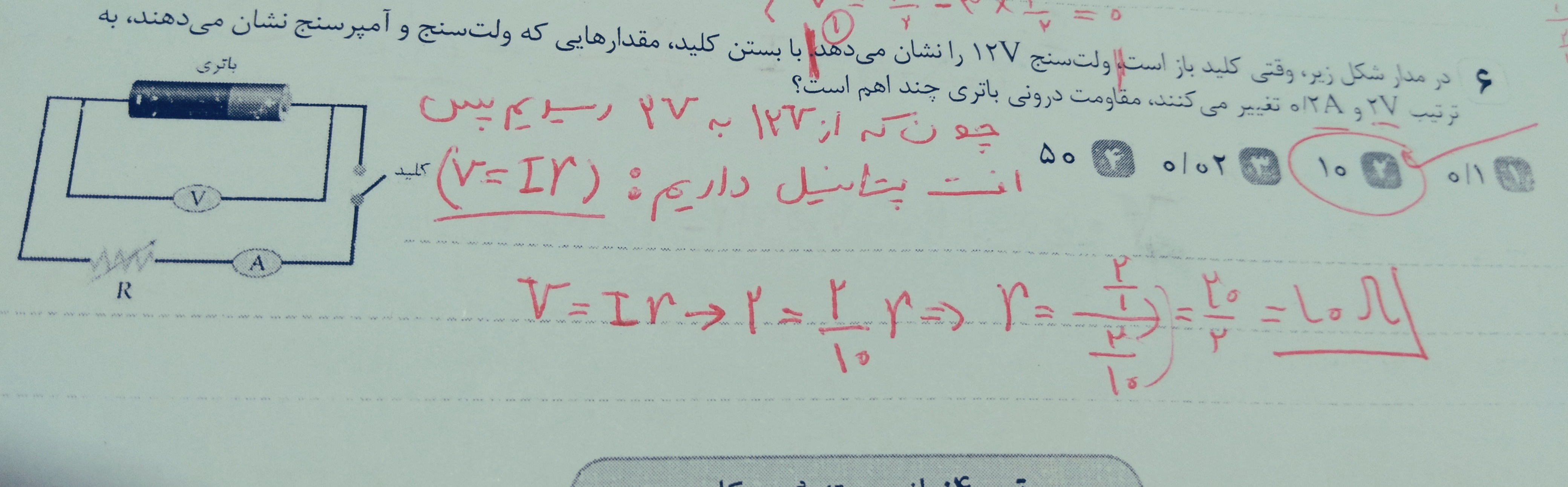 من نفهمیدم چرا کلید و ببندیم جریان زیاد میشه باید طبق رابطه i=£\r+R چون بغیر مقاومت درونی یه مقاومت خارجی هم اضافه میشه کل کسر کوچیک بشه نه زیاذ