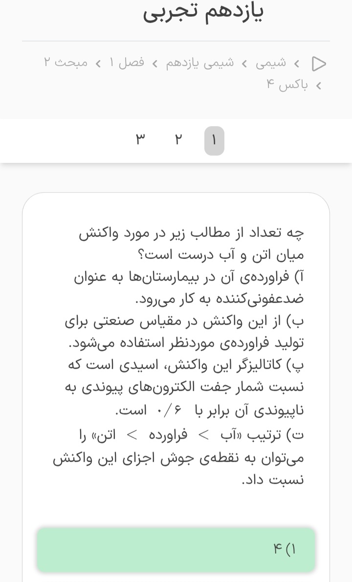آقای رشادی من این گزینه رو غلط در نظر گرفتم و زدم سه مورد درسته ولی پاسخنامه زده هر ۴ مورد درسته و برای مورد پ نوشته همان‌طور که مشاهده می‌کنید هر مولکول آن دارای ۶‏ جفت الکترون پیوندی و ۰‏۱‏ جفت الکترون ناپیوندی است