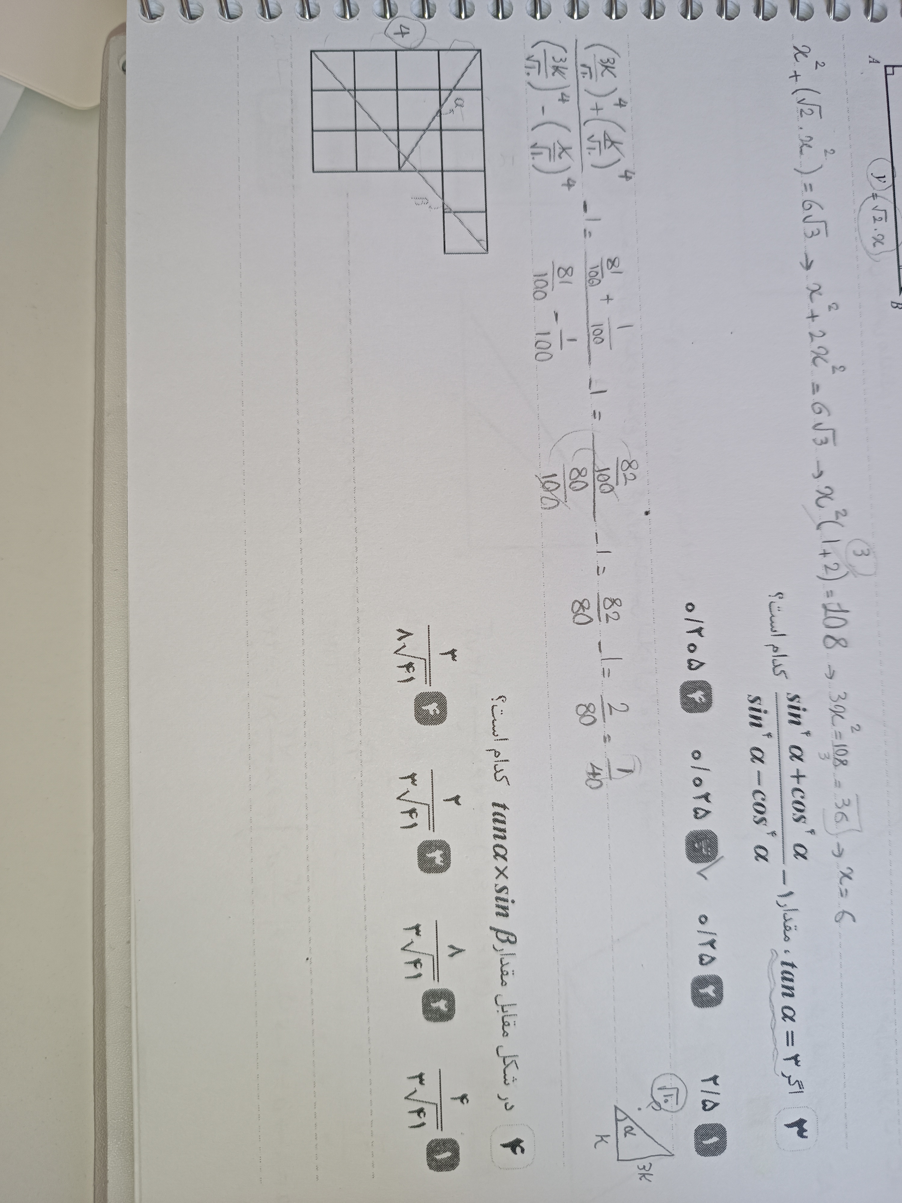 چون tng برابر 3 است پس زاویه الفا 60 درجه است پس sin60 برابر ‌‌‌رادیکال سه دوم است وcos 60 یک دوم است که اگر این اعداد را جایگذاری کنیم حاصل در نهایت یک چهارم یا25. میشود یا گذینه ی 2