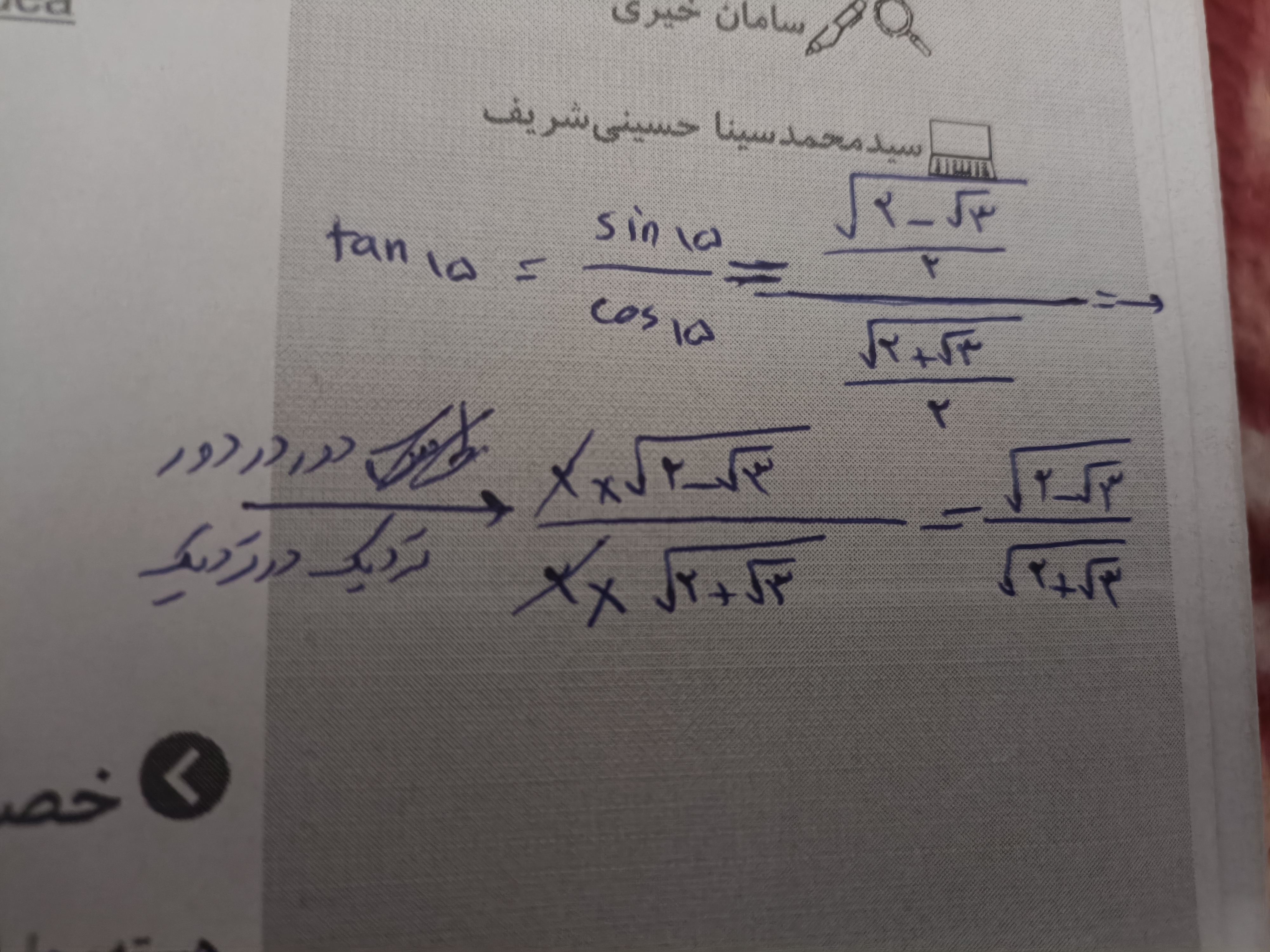 سلام دو عبارت اتحاد مزدوج دارن پس اونها رو به صورت مزدوج در هم ضرب می کنیم از طرفی از مثلاث دوازدهم می دونیم که کوسینوس دوبرابر یه زاویه ای برابر میشه با فرمولی که شما از اتحاد بدست اوردین پس در واقع اینجا نیاز هست شما کوسینوس ۳۰ رو بدست بیارین