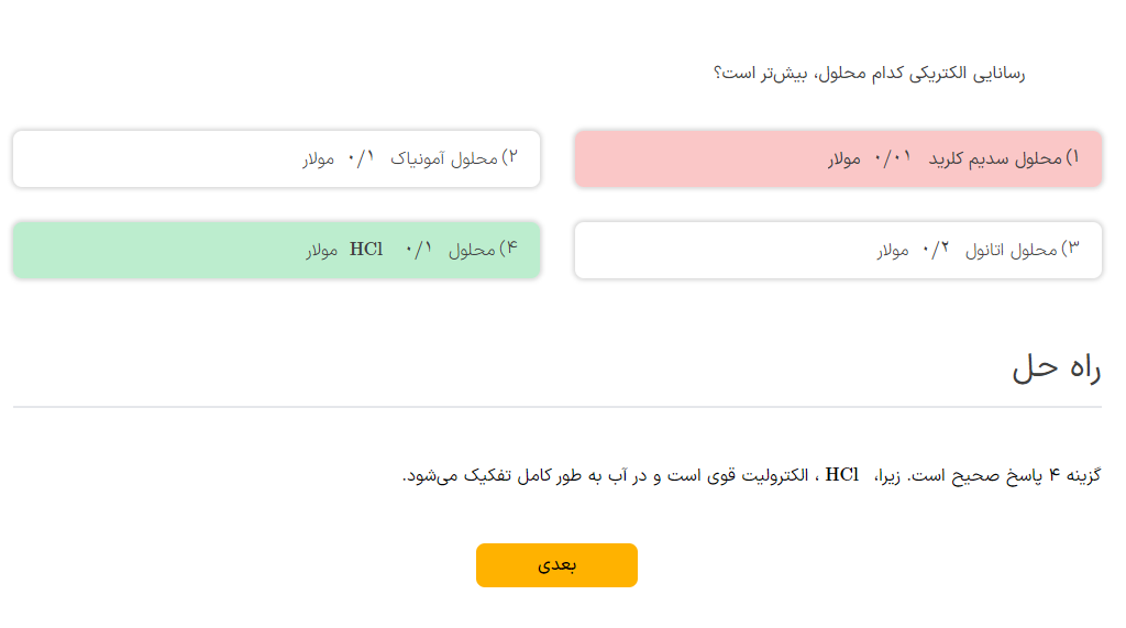 سلام وقت بخیر در تمرینی که گفتی غلظت های سدیم کلرید و HCI با هم برابره پس اونی که قوی تره باشه رسانا الکتریکی بیشتری داره. نکات رو حفط نکن یاد بگیر