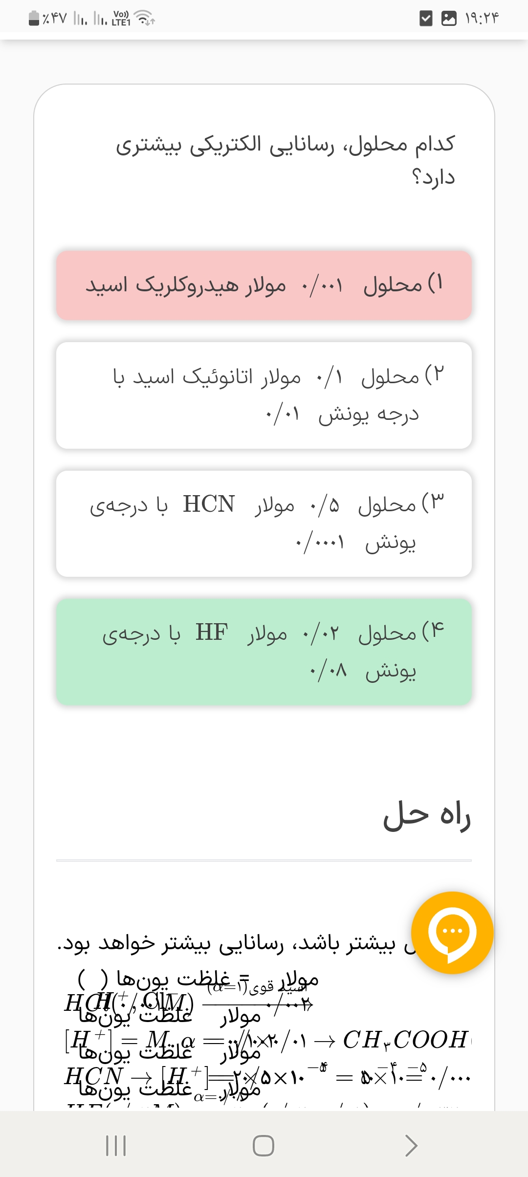 سلام وقت شما بخیر ببخشید میشه بدون محاسبه هم بگیم این سوالو؟ گزینه یک که رد میشه هیچ ...گزینه ۲ هم که اسید ضعیفه اونم هیچ بین گزینه ۳ و ۴ اونی که مولارش زیادتره پس رساناتره یا توی امتحانای نهایی مثلا حتما باید محاسبه انجام بدیم؟