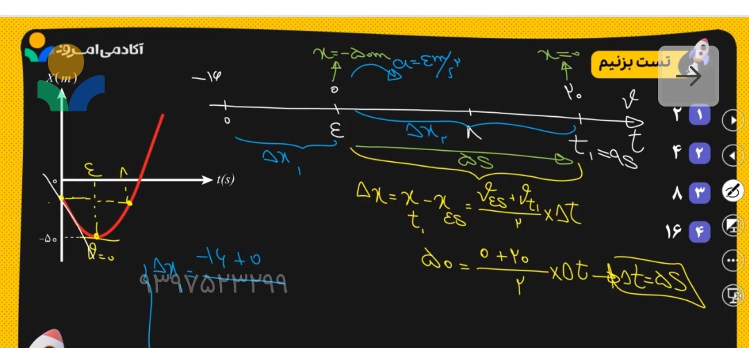 سلام چرا تو این نمودار مکان زمانکه درثانیه ۲سرعت صفر شده و نمودار تغییرجهت داده برای به دست اوردن سرعت متوسط بازه زمانی رو نشکست از ۰تا۲ جابجایی جدا حساب کنه بعد از۲تا۴ جدا بعد با هم جمع کنه و تقسیم بر دلتا t
