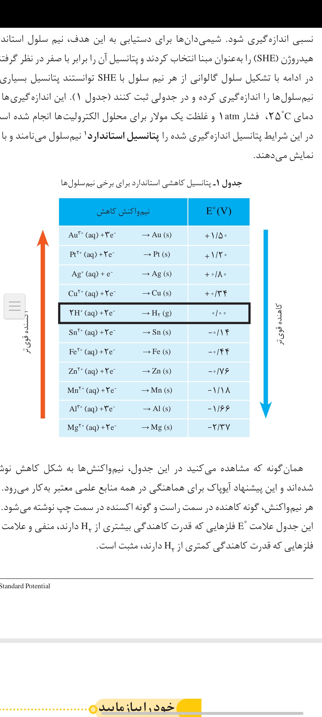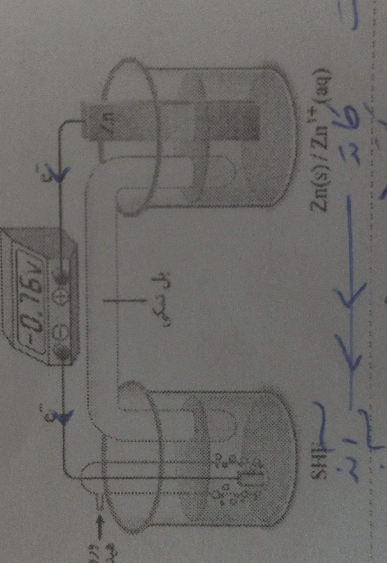 سلام اینجا که علامت ولت سنج متفیه یعنی جهت از کاتد به انده خوب اینجا znپایین تره . کاهنده .آند.اکسایش وsHE بالاتر. اکسنده .کاتد.کاهش اگه جریان ولت سنج منفی باشه یعنی باید از کاتد به اند یعنیSHEبهZnباشدولی اینجا عکسه میشه لطفا ایرادمو بگید