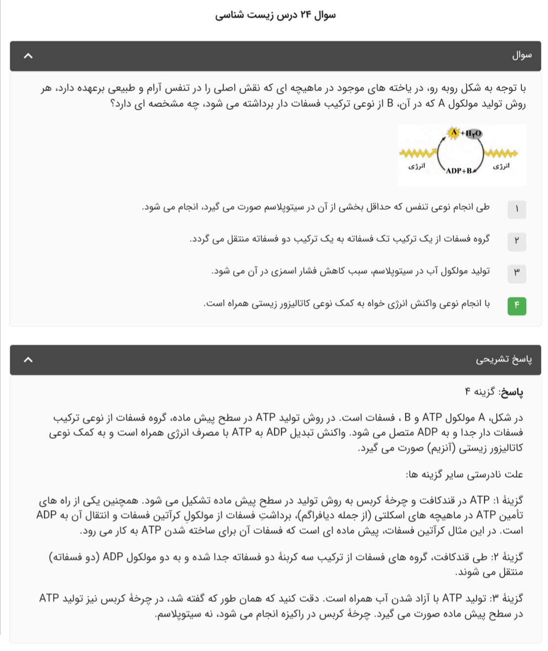 @کیمیا فدعمی ببین شکل و توضیحات داره به ساخت ATP در سطح پیش ماده اشاره میکنه. که این مورد رو میشه در گلیکولیز یا در استفاده از کراتین فسفات اتفاق بیفته اما گزینه 1 فقط داره در مورد گلیکولیز صحبت میکنه