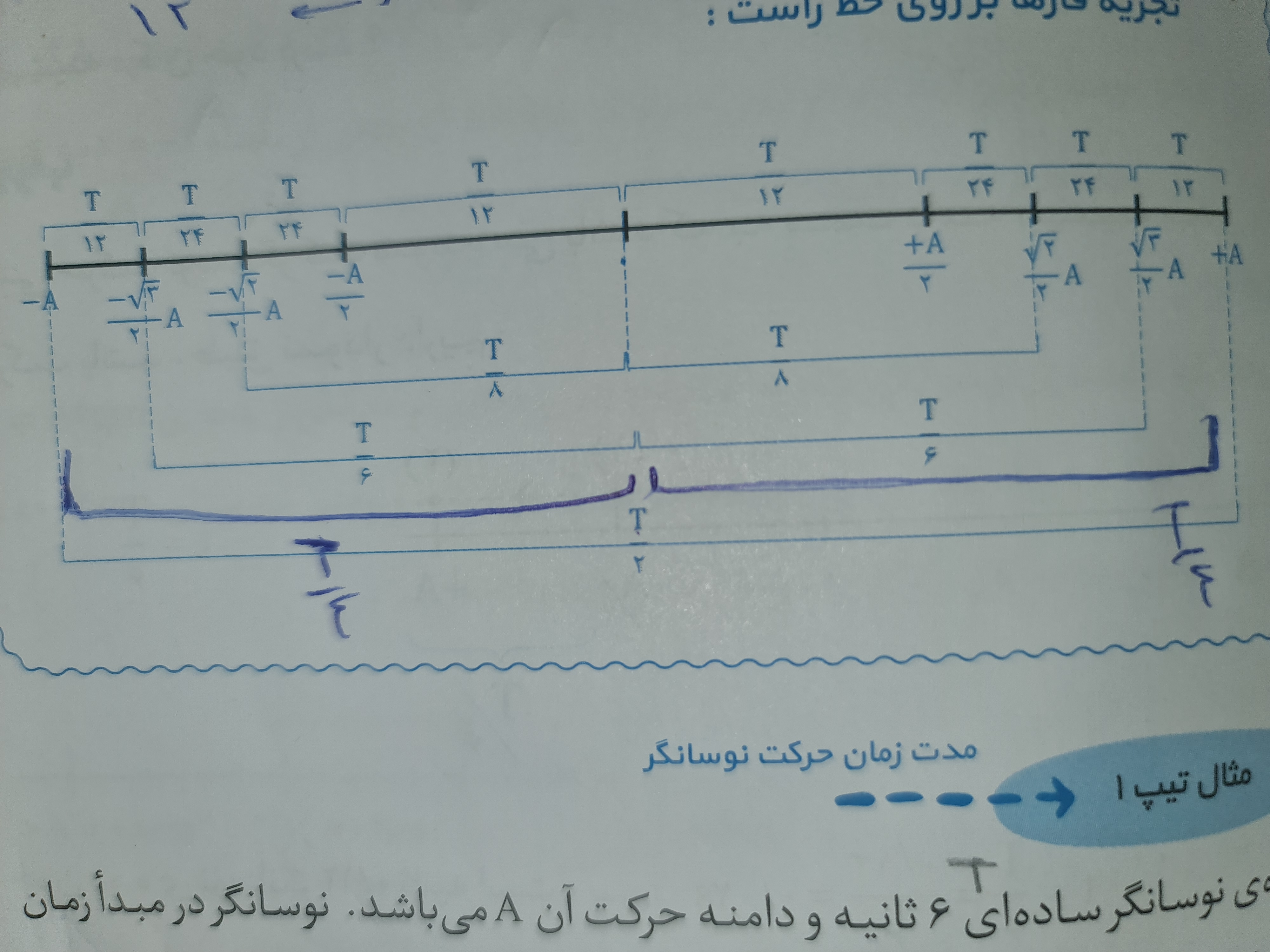 چون صورت سوال گفته هر در یک زمان در انتهای مسیر قرار دارن و ما داریم توی یک بازه زمانی مساوی بررسی میکنیم. یعنی توی اون تایمی که A به نقطه صفر رسیده، در همون مدت زمانی B به نقطه ی منفی A رسیده. این مدت زمان برای هر دو یکسان بوده پس این مدت زمانی رو برای هر دو با هم برابر قرار میدیم. و مدت زمانی رو برای هرکدوم برحسب دوره تناوب هرکدوم مینویسیم تا بتونیم یک نسبتی از دوره تناوب این دوتا بدست بیاریم که در نهایت بتونیم نسبت طول هارو بدست بیاریم