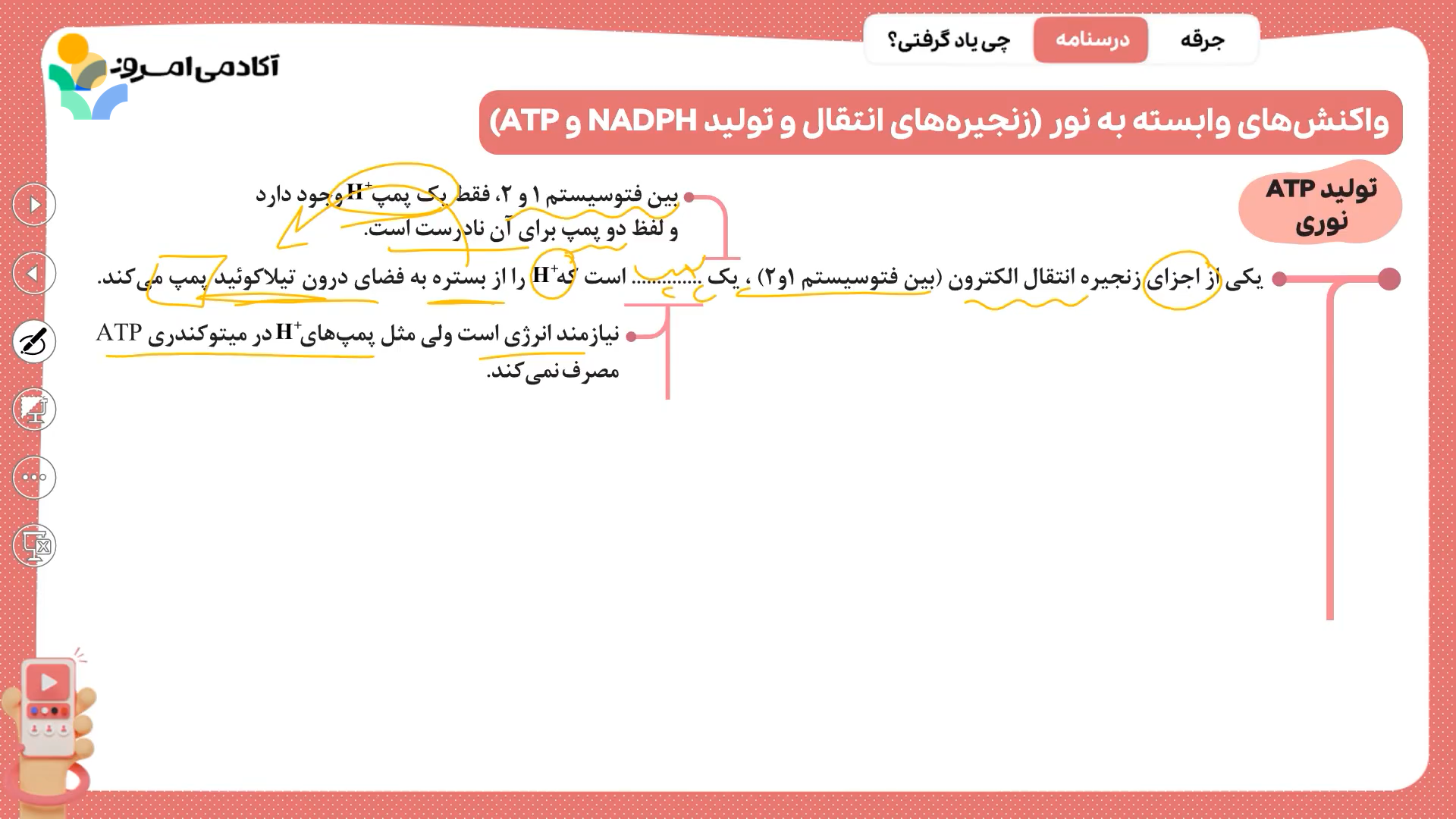 سلام وقتتون به خیر استاد دردقیقه 34فرمودند پمپ درغشاتیلاکوئید مثل پمپ های غشایی میتوکندریatpمصرف نمیکنند ولی پمپ های غشای میتوکندری از انرزی الکترون هاکه حامل های الکترون می اوردند استفاده میکنند لطفا راهنمایی کنید ممنون