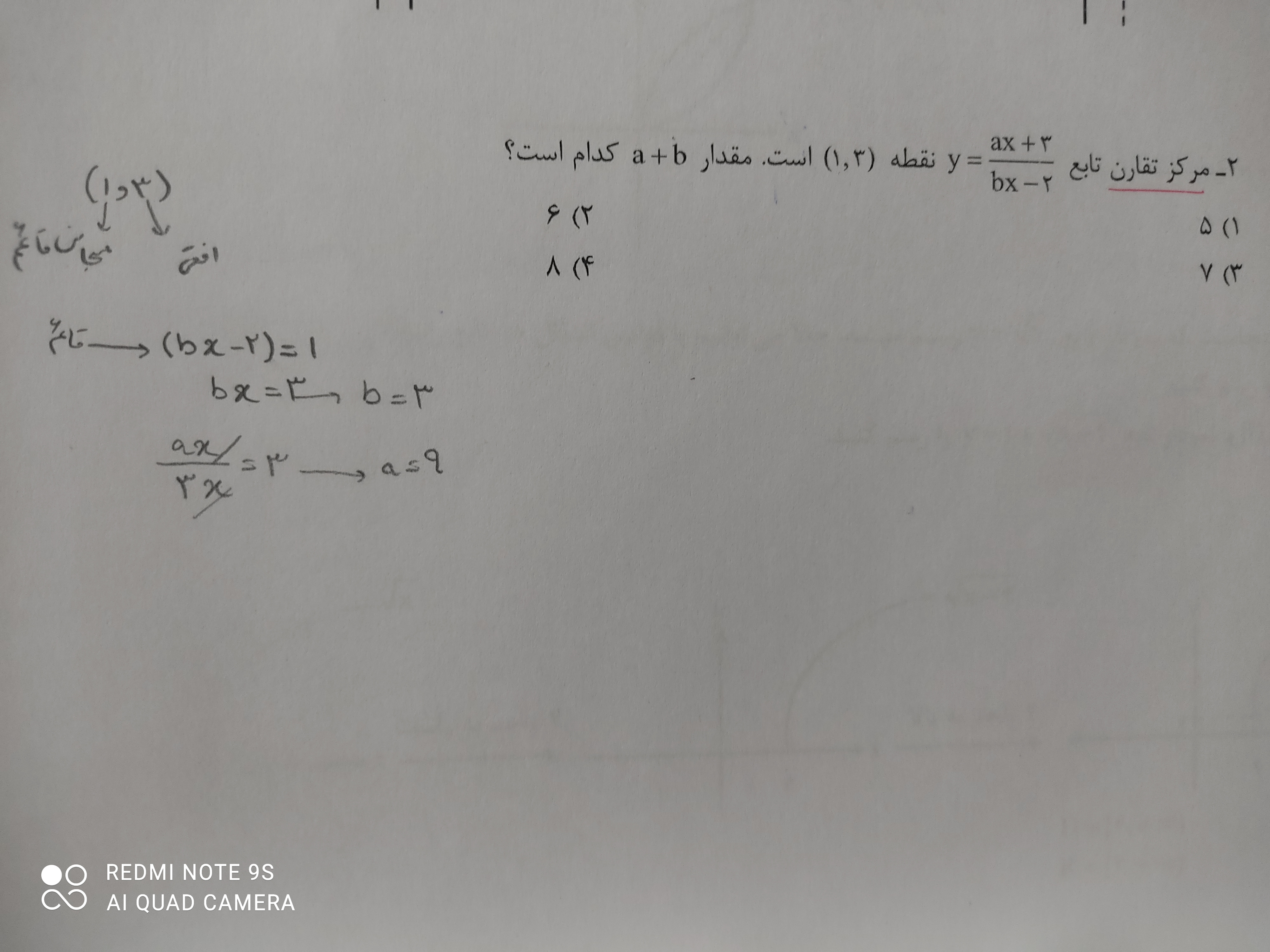 سلاااااام سئوال ب ما نقطهي (3و1) رو داده يعني ريشه مخرج ما يك هستش، ك اگر داخل مخرج قرار بديم بايد صفر بشه پس: b(1)-2=0 در نتيجه b=2 حالا از فرمول مجناب افقي ax/bx=3 ايكس ها ساده ميشن bهم 2 هستش در نتيجه a=6 و جمعشون ميشه 8 گزينهي 4 موفق باشي :)