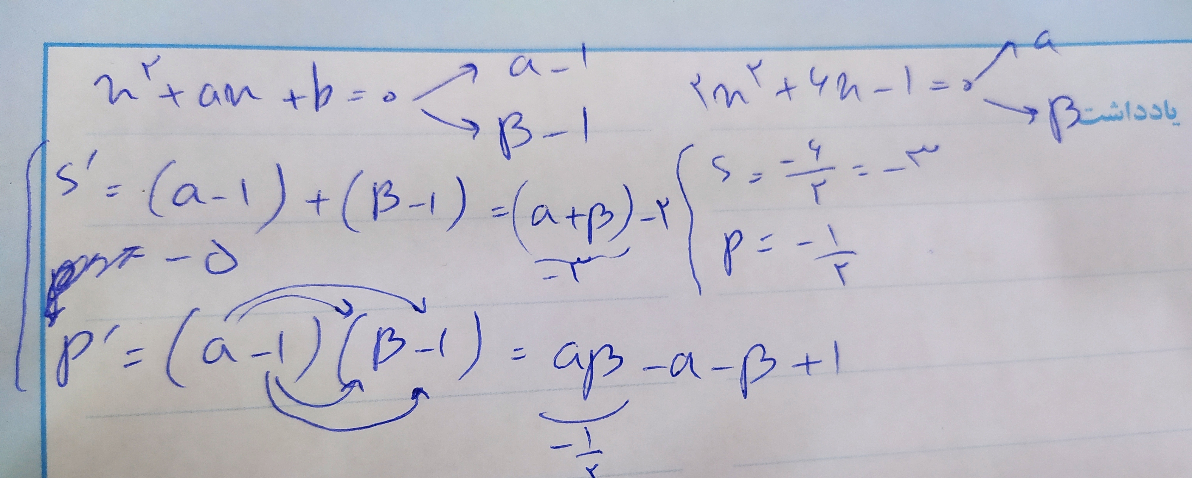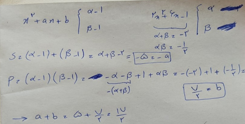 @نرگس ولی سلام وقت بخیر این روش استاد متوجه شدم اما منم اومدم ریشه های معادله دوم رو الفا و بتا گرفتم و ریشه های معادله اول الفا منهای 1و بتای منهای1 گرفتم اما به جواب اخر نرسیدم