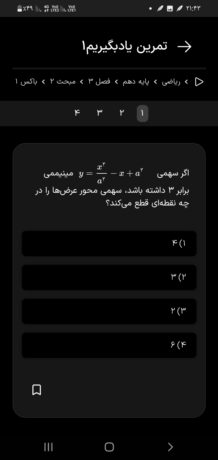 سلام و وقت بخیر مثلا اگه توی گزینه ها دو گزینه دو تآ جواب داشت و دو گزینه یک جواب داشت و با توجه به اینکه گفته محور x ها را با کدوم طول قطع می کنه و چون نگفته طول"ها" پس ما اون گزینه هایی رو حساب می کنیم که یک جواب داره و دلتا رو مساوی صفر می گیریم ؟