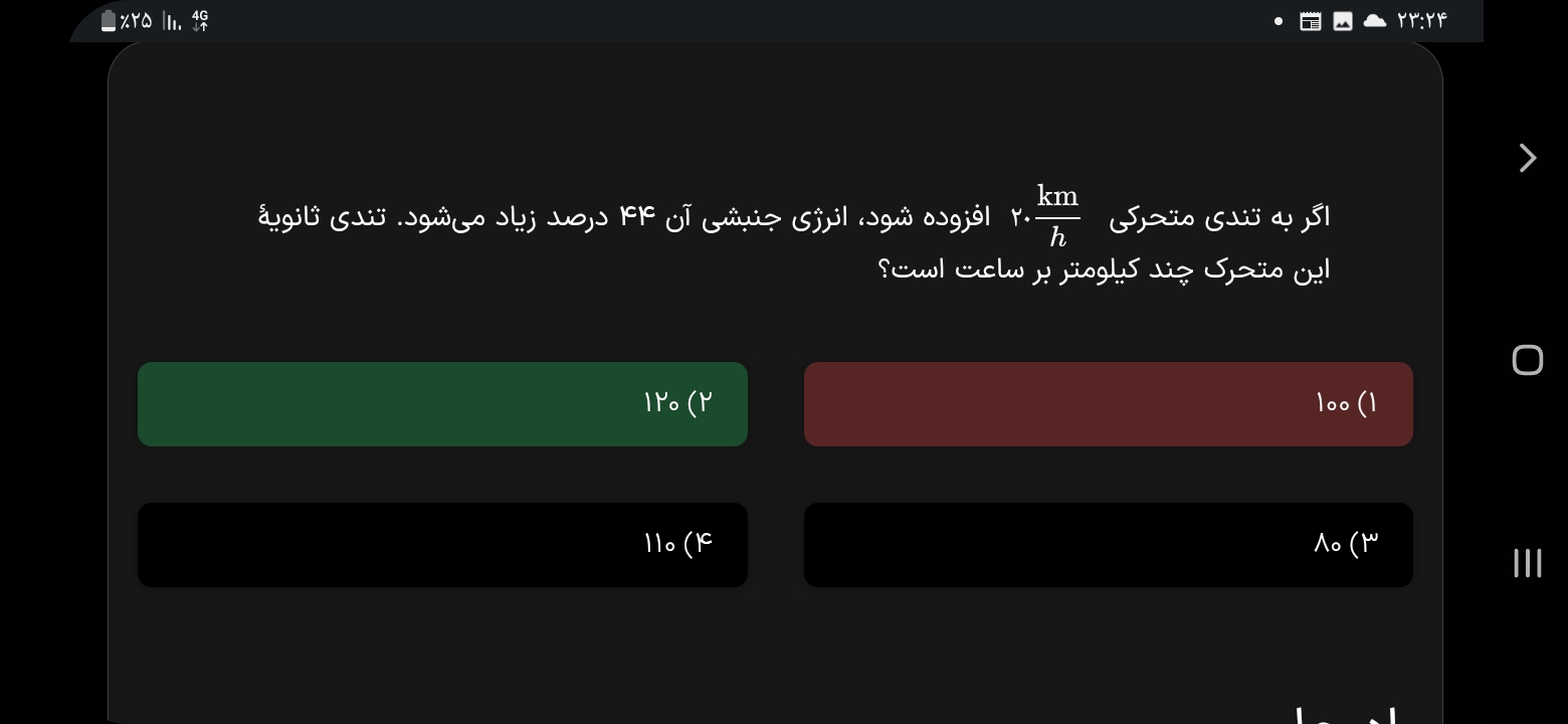 سلام بله شما سرعت اویه رو صد بدست اوردیین و سوال سرعت ثانویه رو میخواسته طبق گفته سوال سرعت نهایی 20 تا بیشتره پس 100 رو با 20 جمع میکنیم میشه120