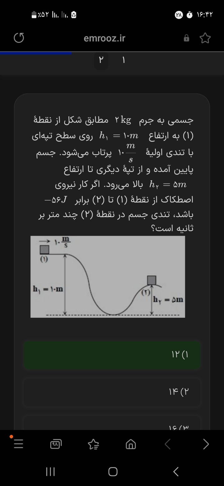 سلام E2-E1 رو باید بدست بیاری و مساوی با مقدار کار نیروی اصطکاک بزاری E2 برابر میشه با انرژی جنبشی و پتانسیل جسم در حالت دوم E1 برابر میشه با انرژی جنبشی و پتانسیل جسم در حالت اول