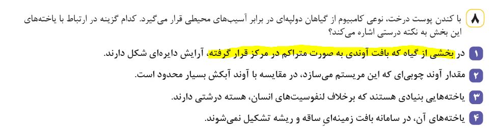 ببخشید در جزوه‌ی ما گزینه 1 توضیحات بیشتری داره. بازم منظورش میشه همون سامانه آوندی پسین؟ یعنی از آبکش پسین تا مرکز تنه ی درخت؟