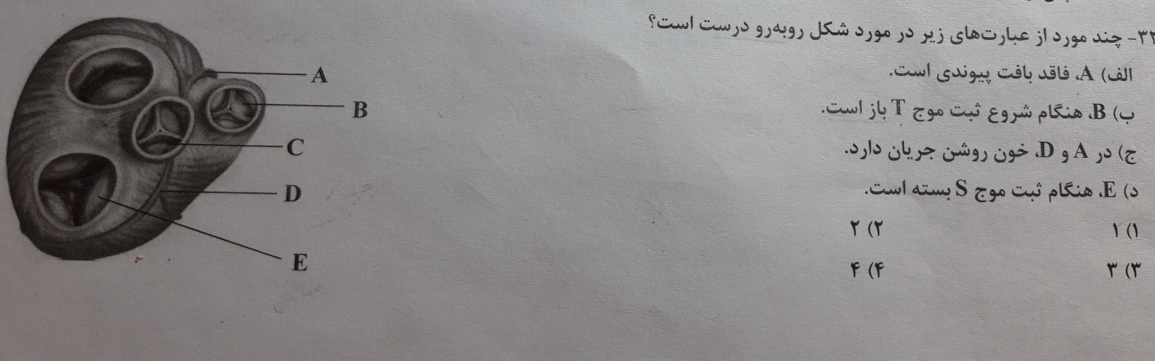 سلام. دریچه سینی هنگام شروع ثبت موج T یعنی انقباض بطنی و نه شروعش . وسطای انقباض بطنیه . گزینه چهارم هم از این نظر مشکلی نداره که بگه کدوم قسمت اون نمودار اتفاق میفته ، چون دیگه جور دیگه ای نمیتونسته طراح این سوال رو مطرح کنه.