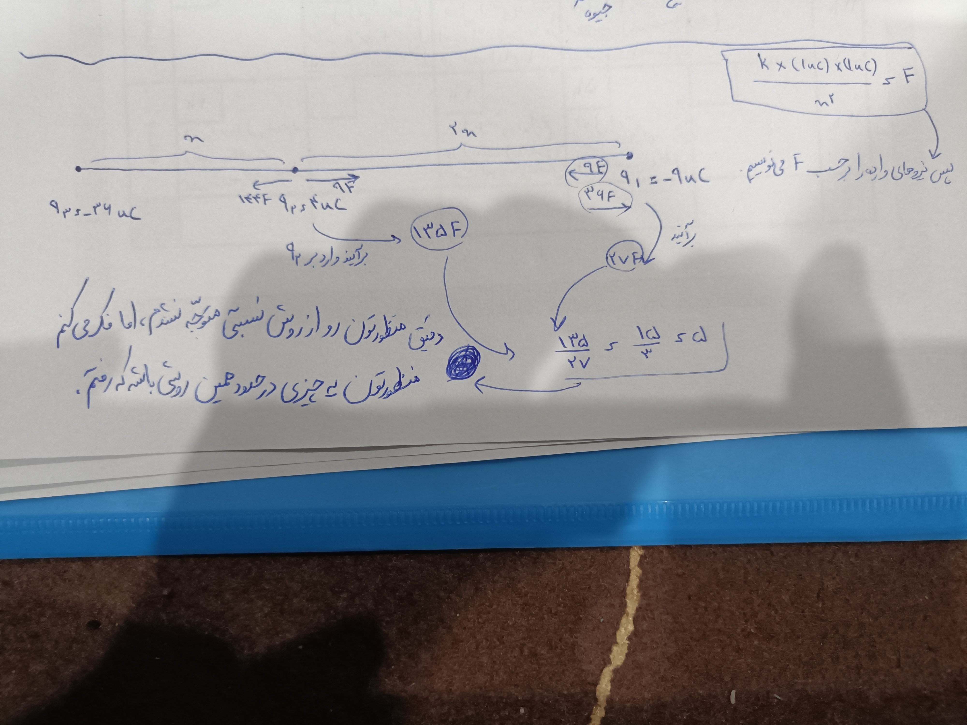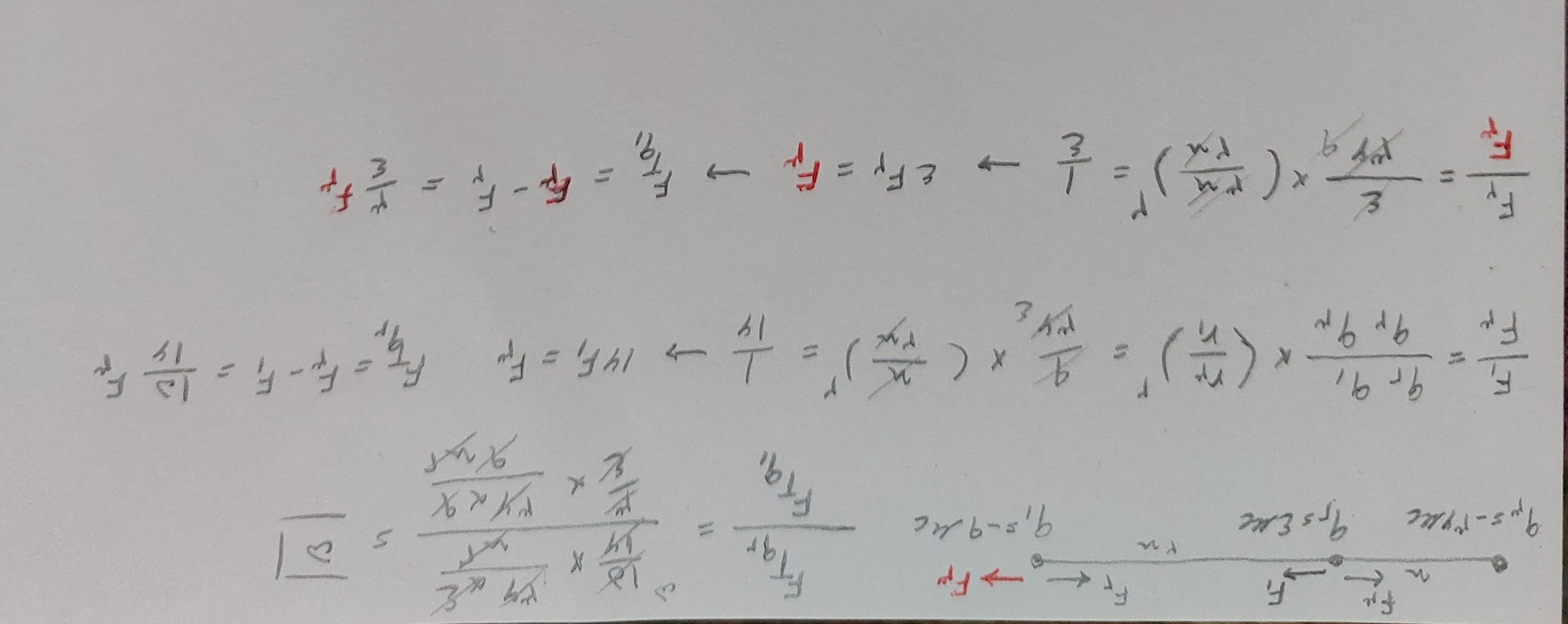 سلام استاد گفتن که ما از این فرمول برای پیدا کردن فاصله بین بار ها استفاده میکنیم( در شرایطی که برآیند نیرو رو روی یه بار مد نظر صفر بگیریم ) و وقتی فاصله رو پیدا کردیم اگر اندازه بار رو دادن که هیچ ، نیرو رو پیدا میکنیم و اگر خواستیم که اندازه بار رو پیدا کنیم اون موقع برآیند صفر رو ، روی باری در نظر میگیریم که برامون اندازش مشخصه ، بعدش همین روال رو میریم و اندازه بار ها رو در فاصله اون یکی بار تا مبدا ضرب میکنیم و دوتا رو مساوی هم قرار میدیم و ساده سازی میکنیم ،