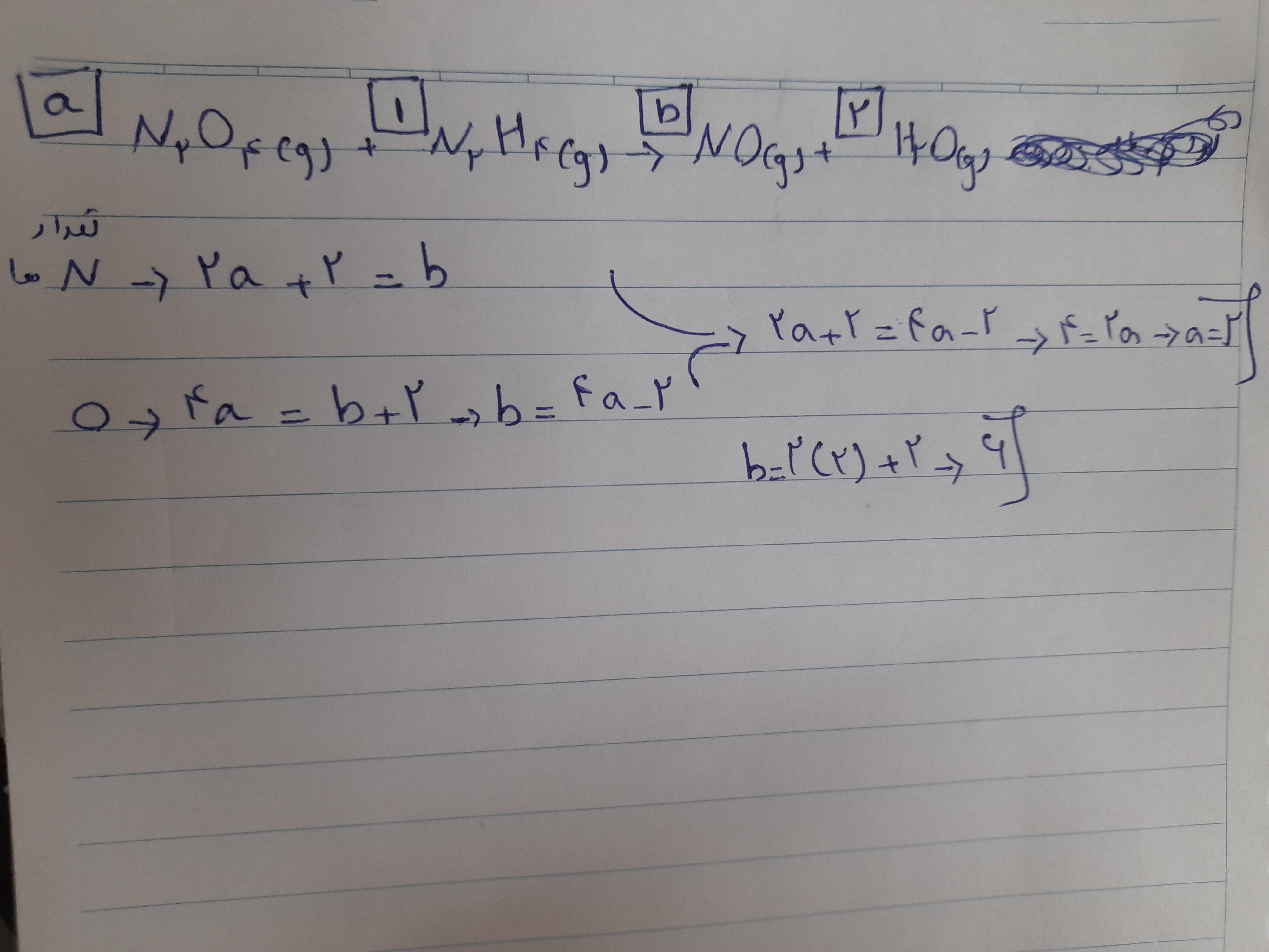 @مطهره سادات حسینی سلام به عکسی ک فرستادم توجه کنین 👆 ما فقط میتونیم Hرو موازنه کنیم اونو که انجام دادیم بجای بقیه ضریب aوb میزاریم و تعداد N ها رو در دو طرف حساب میکنیم و تعداد Oها هم همینطور بعدش معادله دومجهول میاد که من اومدم b هارو برابر هم گذاشتم از هر معادله و a و b رو بدست اوردم