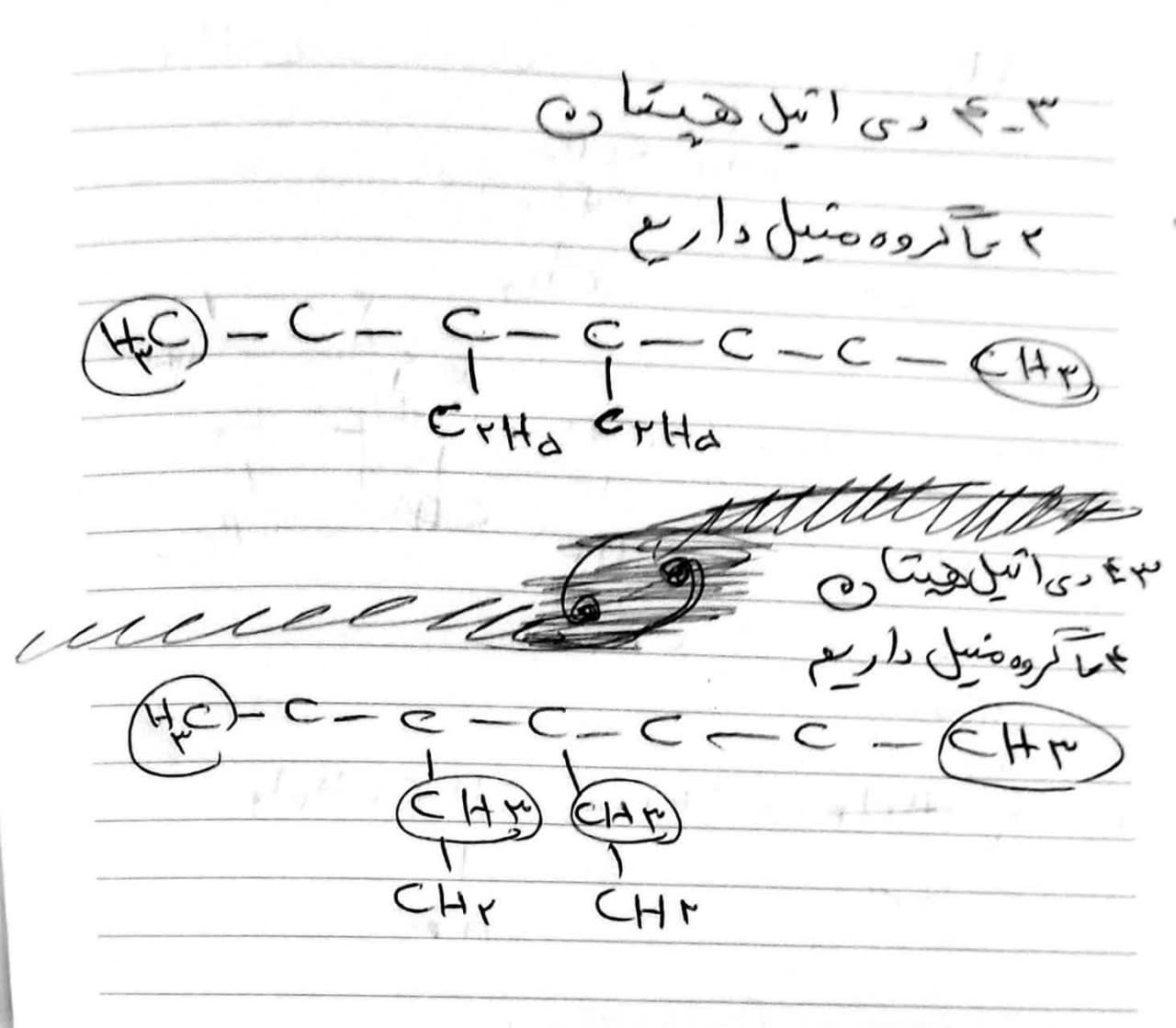 سلام خسته نباشید یه برداشتی از این تست داشتم اگه میشه بگید درسته یا نه زمانی که هپتانی که گفته رو رسم میکنیم اول(همون هفت کربن رو که میکشیم) ساختار رو که نگاه کنیم میبینیم که فقط کربن های سر و ته این ساختار قابلیت داشتن سه تا هیدروزن رو دارن اونا رو مشخص میکنیم بعد میریم سراغ 3و4 دی اتیل (و اگه بجز این دو در قسمت های دیگه از ساختار میتونستیم متیل ببینیم اول اونا رو هم مشخص میکردیم)