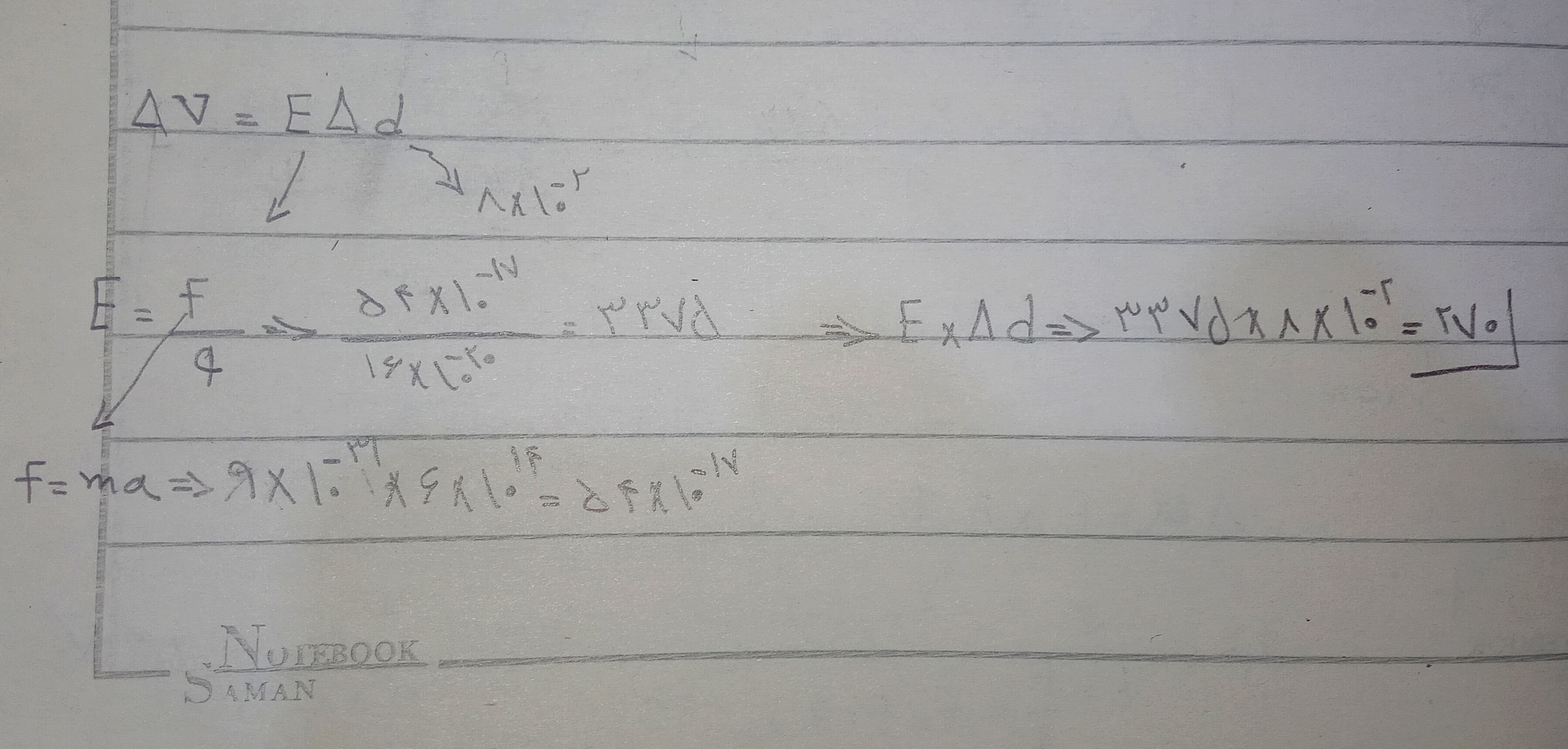 سلاام سلاام...استاد روابط این تستو یخورده پیچیده کردن..بزارید قدم به قدم توضیح بدم که چجوری اسونتره..: ببینید ما داریم: V=Edدلتا ؛ خب حالا میتونید بجای F/q ، E بزارید.... حالا باز میتونید بجایma ، F بزارید.. در نهایت این رابطه بدست میاد: V=mad/qدلتا...تمام شد رفت حالا رااحت جاگذاری کنید..🎁رسیدن ب رابطه نهایی اینجوری راحتتر نبود..؟