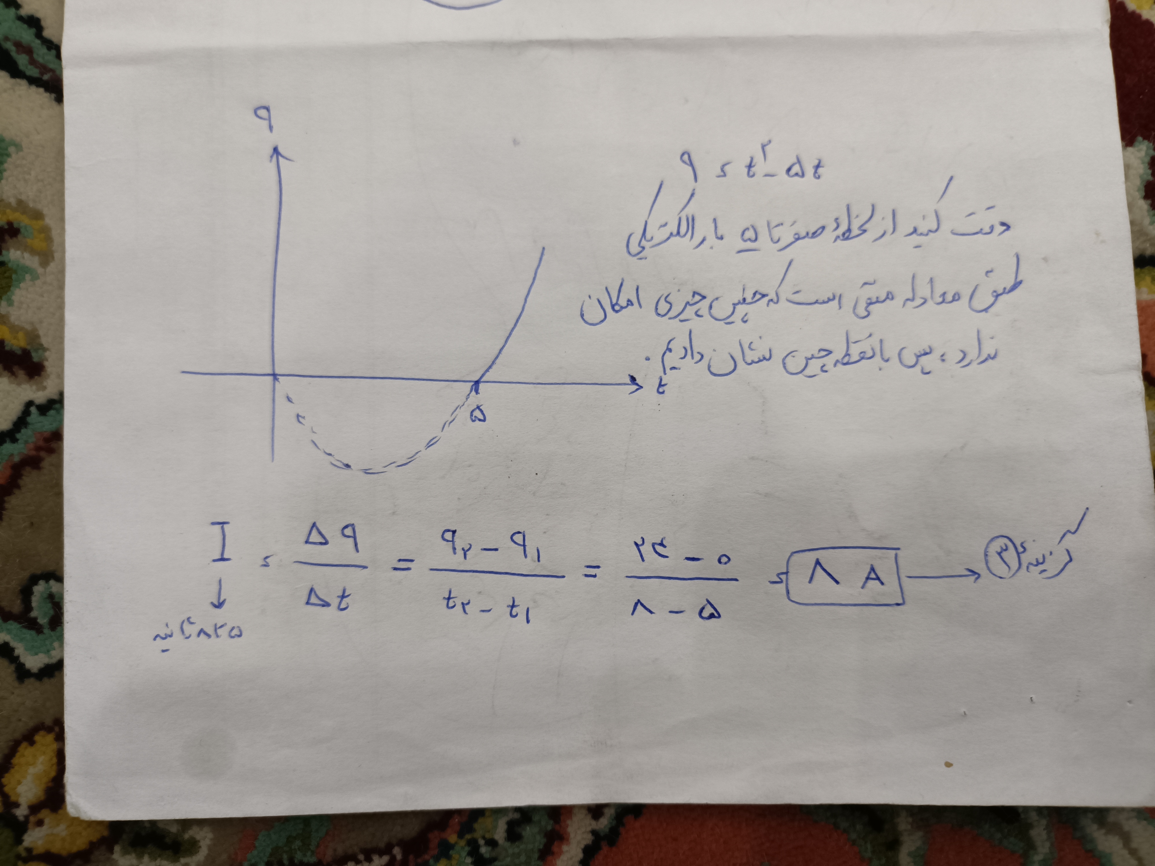 یه راه اسون تر هم هست وقتی معادله رو بد بدن . تو درسنامه استاد اشاره کردن که شیب نمودار q-t به ما i میده . خب این به زبون ریاضی میشه مشتق . پس مشتق q به ما i میده . راحت مشتق میگیریم t رو جایگذاری میکنیم جواب مستقیم بدست میاد .