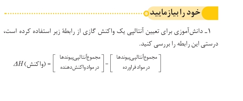 ببخشید عبارت دوم ما تا اینجا برای مقایسه آنتالپی واکنش دهنده ها و فرآورده ها برسی می کردیم که کدوم در سطح انرژی بالاتریه اون آنتالپی بیشتری داشت ولی در واکنش های آنتالپی از نوع پیوند ما باید ببینم کدوم فاصله بیشتری با حالت اتم داره درست؟