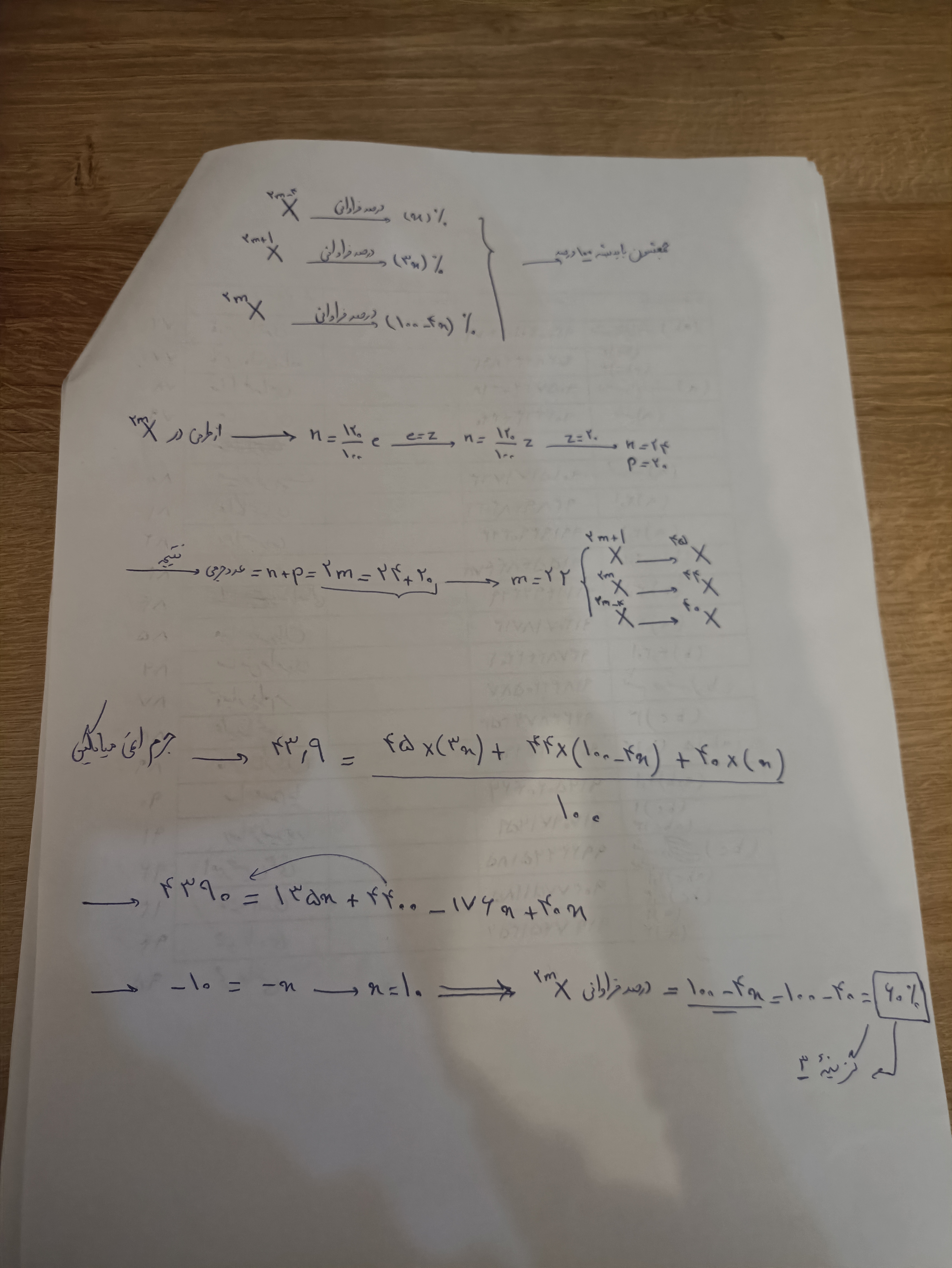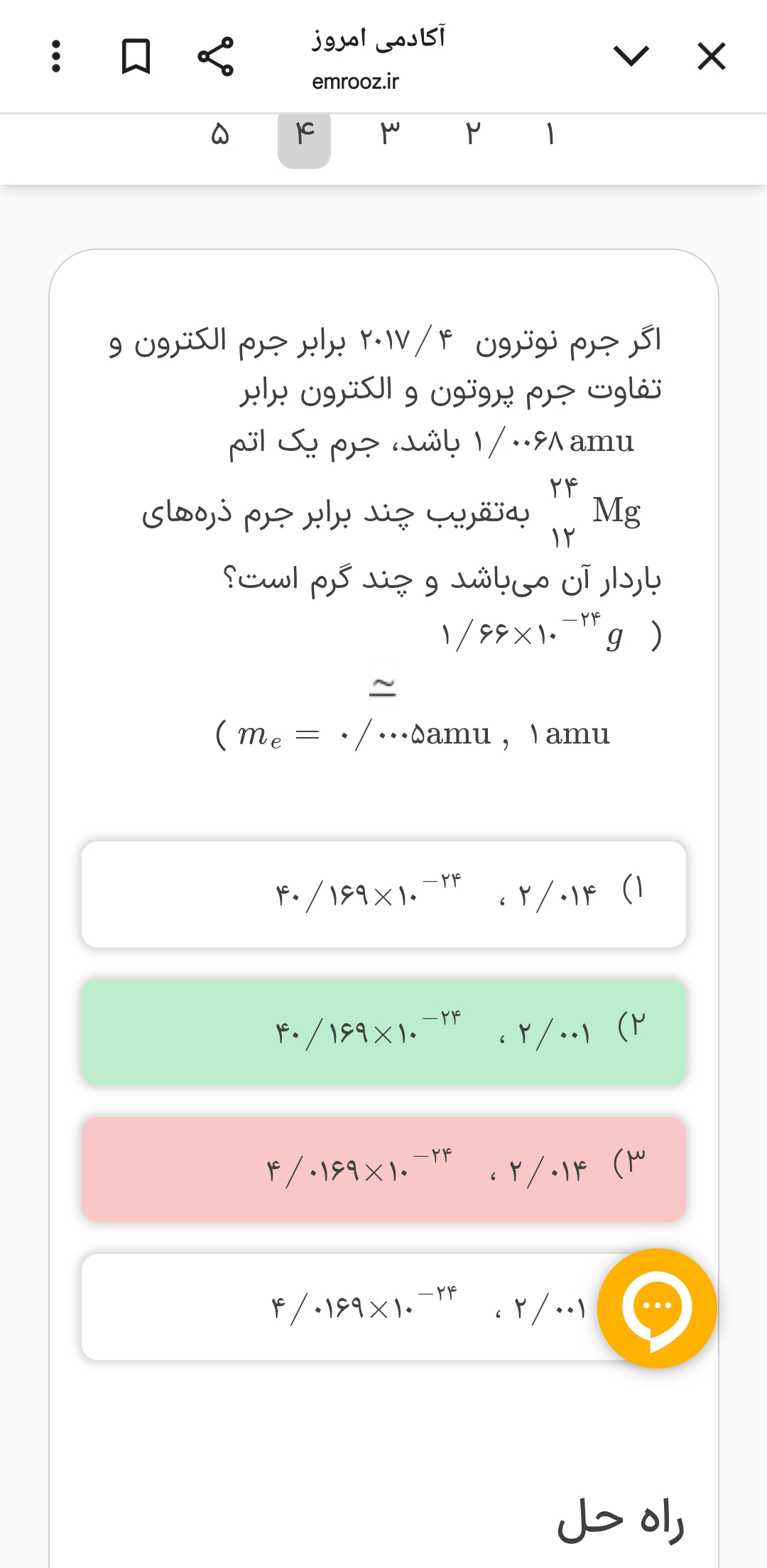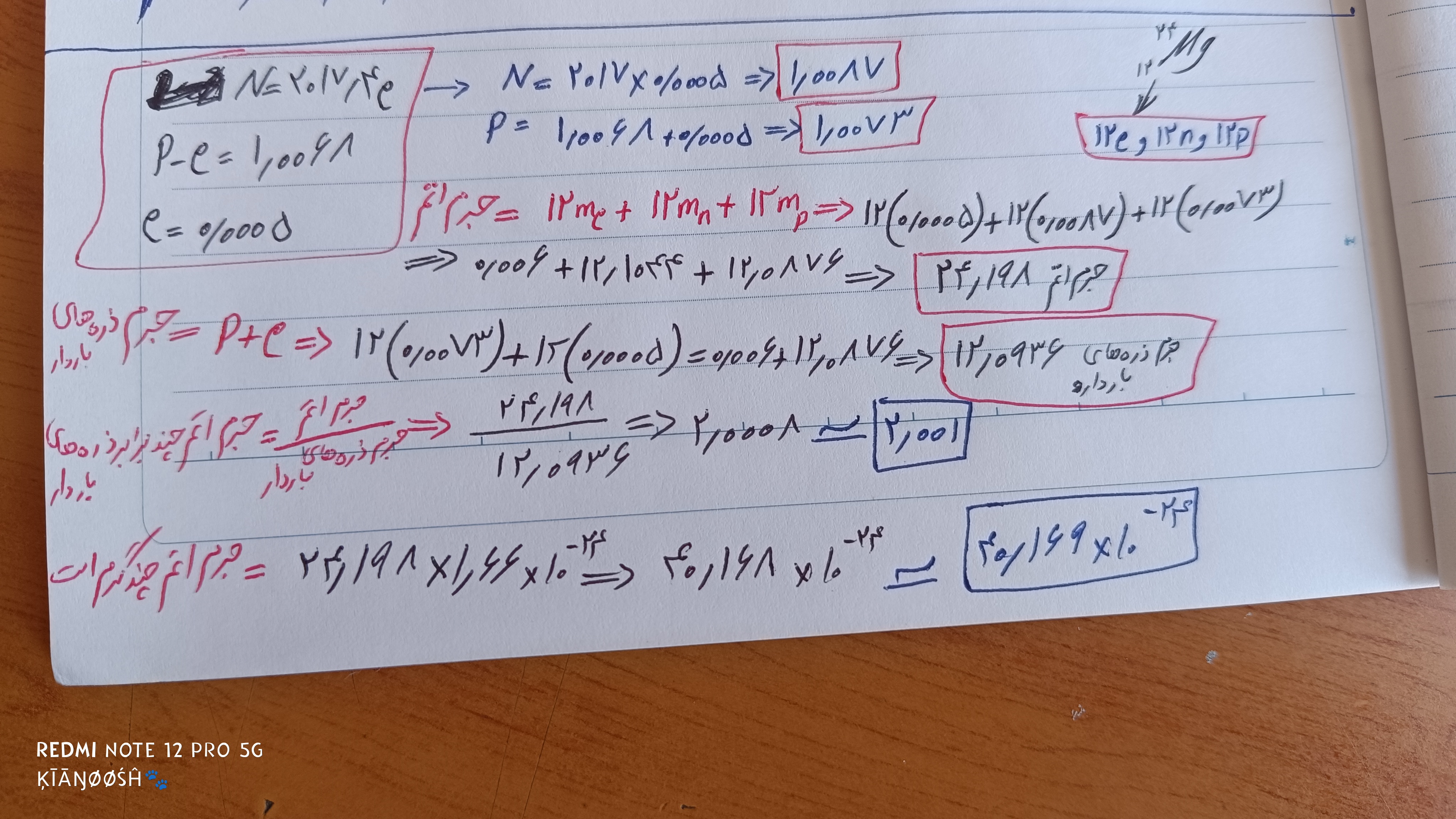 درود، بفرمایید این هم راه حل، فقط عذر میخوام توی جای‌گذاری اشتباهی پروتون و نوترون که 1/0073 و 1/0087 هستن رو 0/0073 و 0/0087 نوشتم شرمندم. فقط الکترون هستش که ۱ نداره یعنی کوچیک تر از ۱ هستش