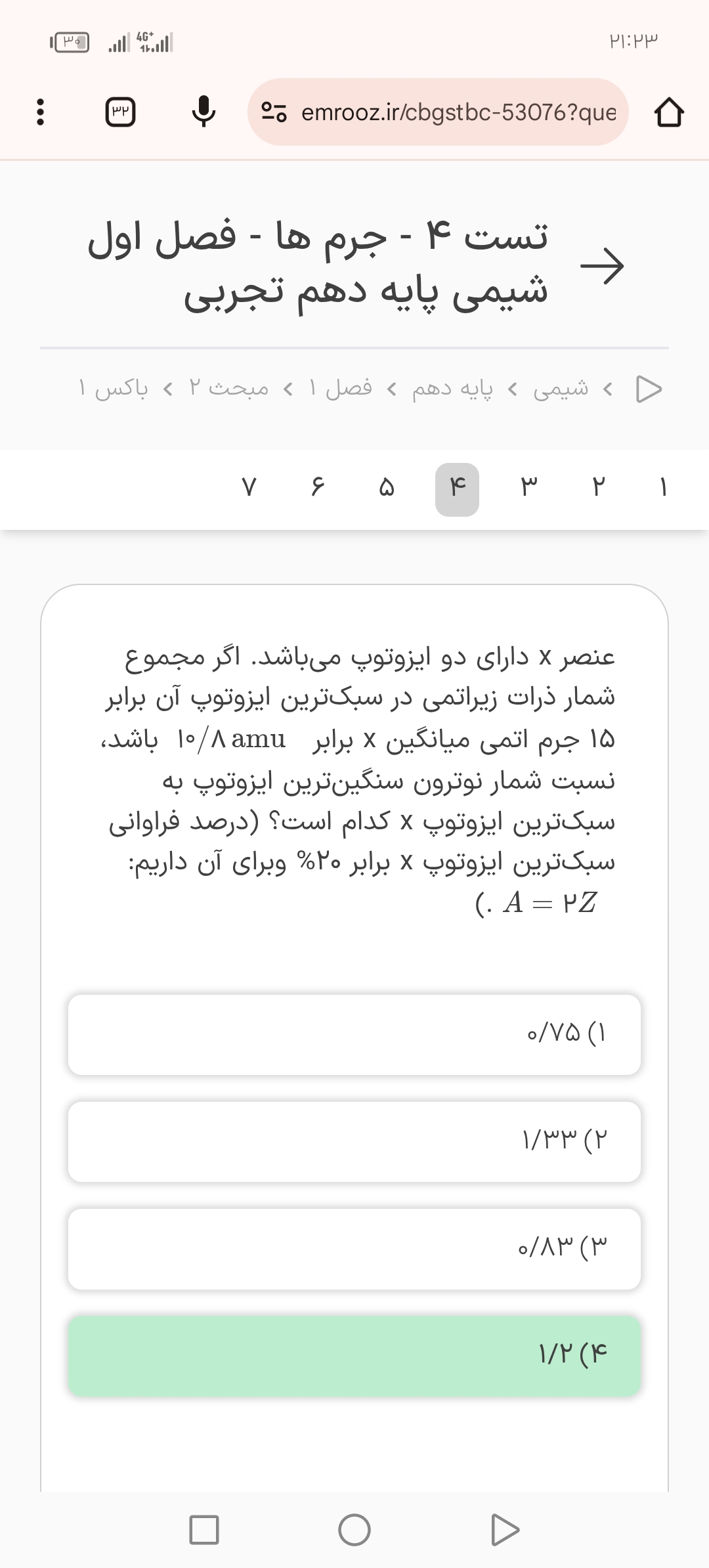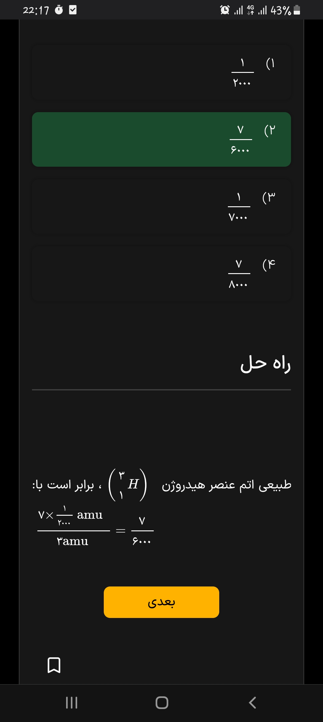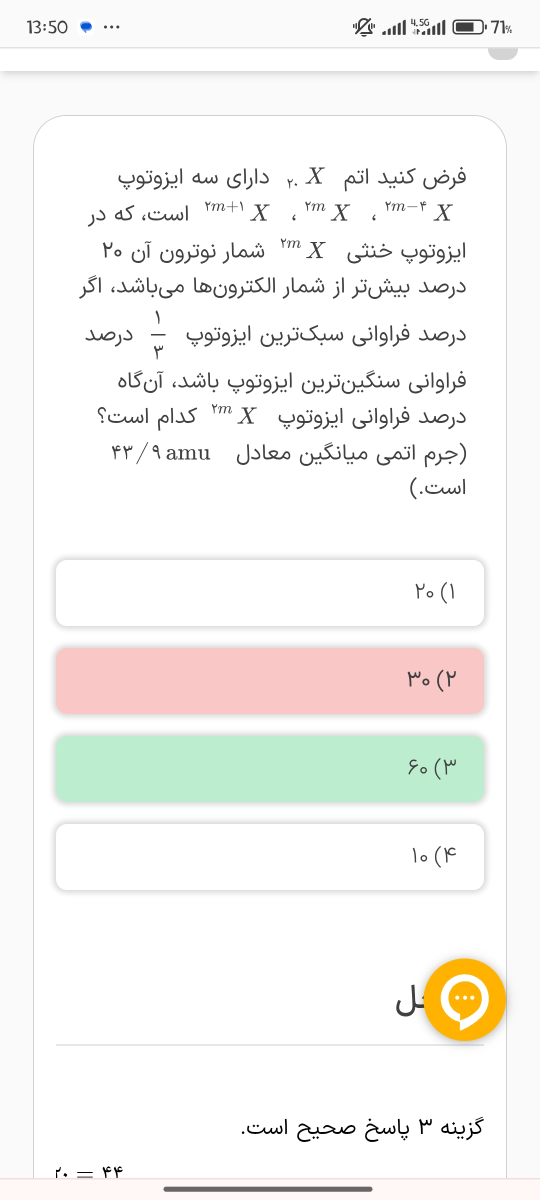 یه جا استاد برای محاسبات اومدن 1.99 رو 2 در نظر گرفتن. من دقیق که حساب کردم حاصل کل اون عبارت شد 26.19 درحالی که استاد 24.29 به دست آوردن( جرم اتمی میانگین منیزیم) . حالا اگر 26.19 رو بعلاوه ی 37.98 کنیم، جرم اتمی میانگین منیزیم فلوئورید میشه 64.17 !!! این عدد توی گزینه ها نیست ولی به گزینه ی 3 نزدیکه. جواب استاد شد گزینه ی 2 !!!! اینهمه تفاوت در تقریبی به دست آوردن اعداد طبیعی نیس :||