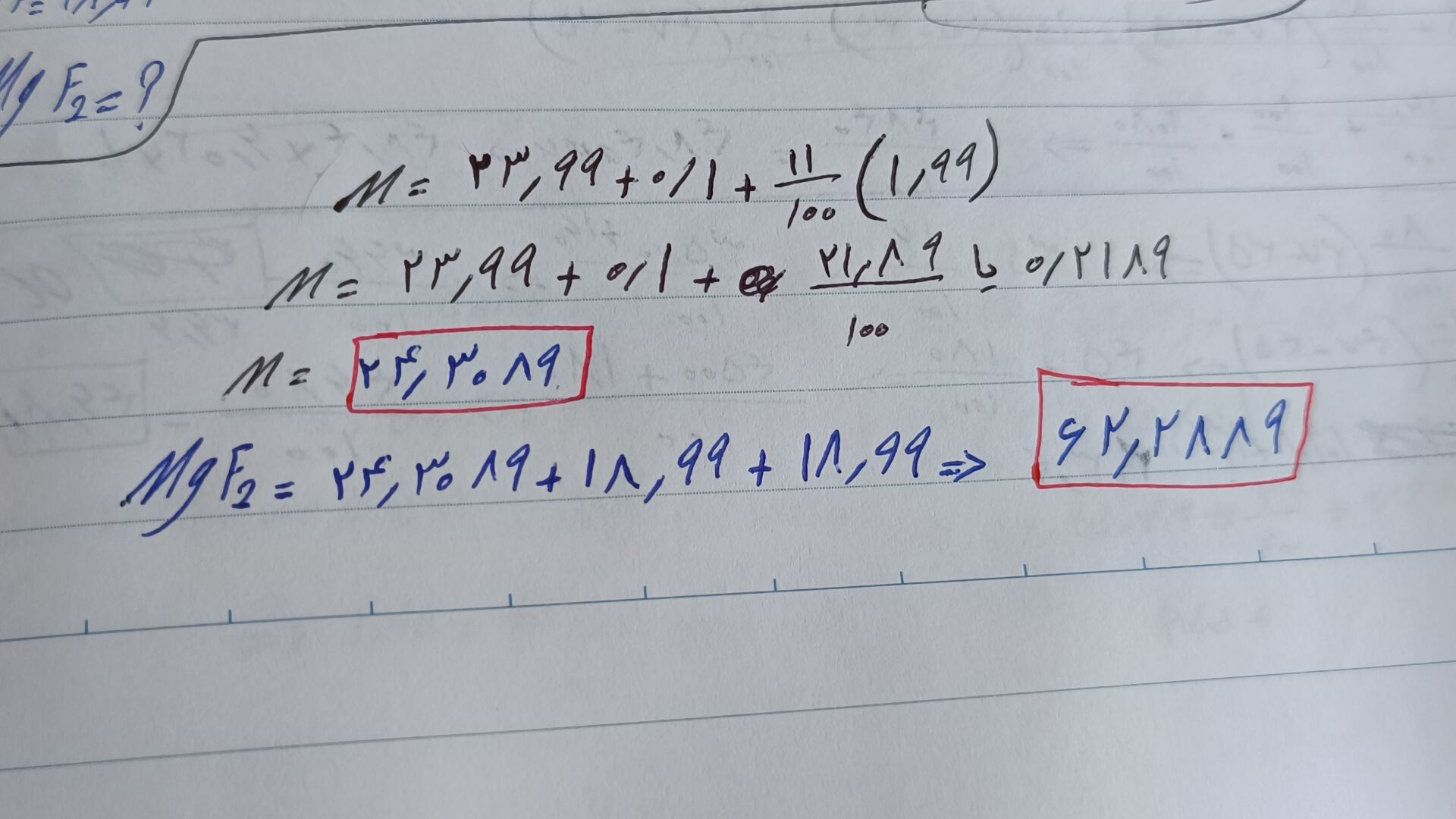 درود، شما در محاسبه جرم اتمی میانگین منیزیم اشتباه داشتید. من بصورت دقیق و بدون ارفاق حل کردم و هم جرم میانگین منیزیم و هم جرم MgF2 رو براتون با راه حل فرستادم