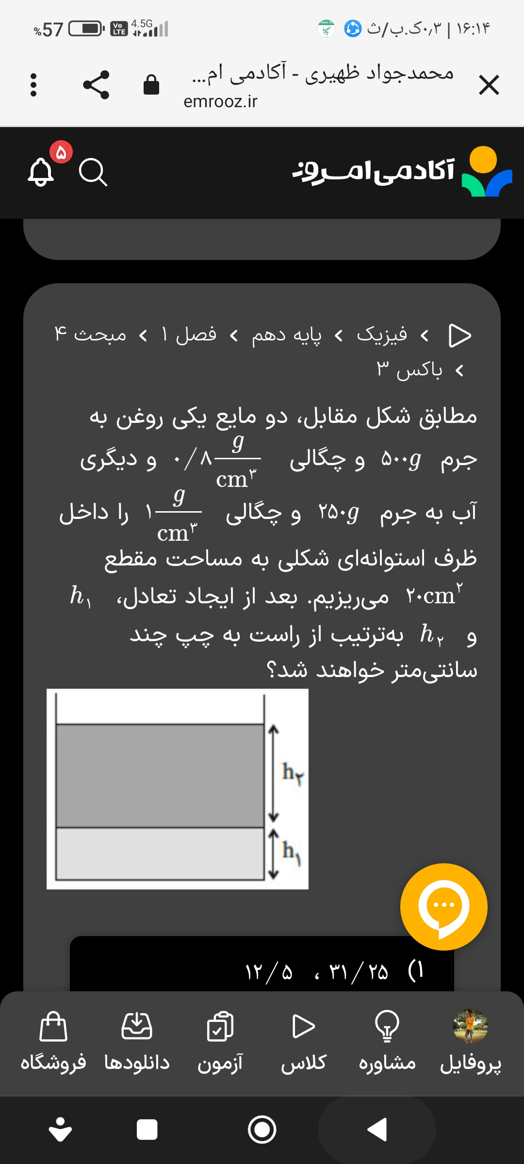 @فاطمه رحیمی نسب سلام ببخشید توی این سوال استاد گفتند که وقتی چند مایع مخلوط نشدنی رو درن ظرفی بریزیم و از را بطه v=Ahاستفاده میکنیم سطح مقطع شون برابر هستش پس چطور سوال به ما اطلاعاتش رو به ما داده ؟ ما میتونیم درنظر نگیریمش