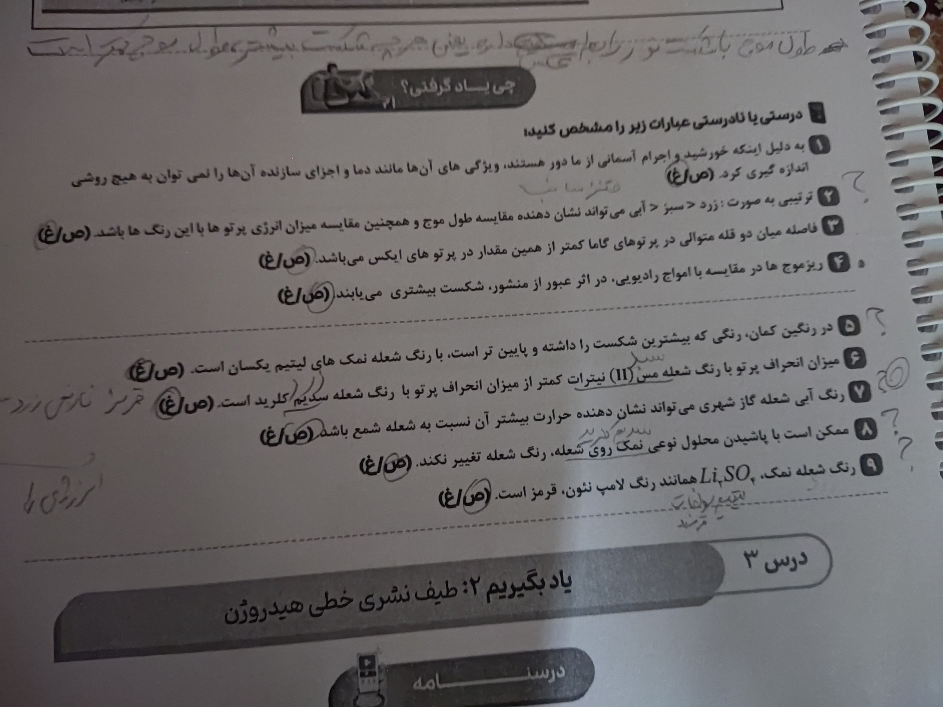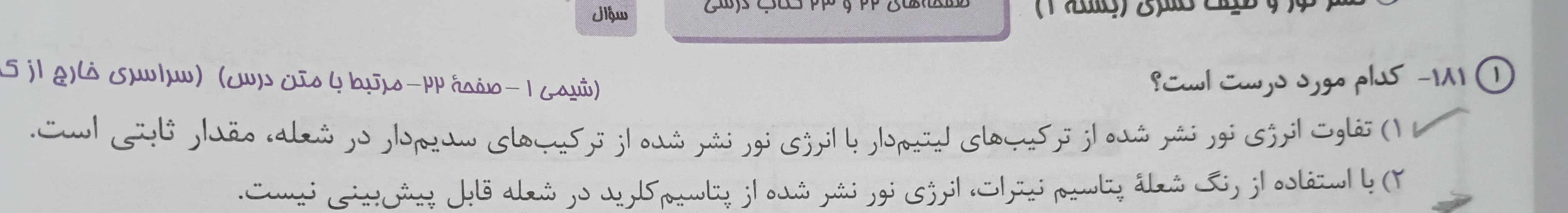 سلام ببخشید میشه بهم بگید در سوال زیر گزینه یک چرا درسته ؟ من شکل کتاب رو دیدم سدیم علاوه بر زرد ، طیف خطی نشری سبز و قرمز هم داره که مشابه زرد نیستن پس چرا گفته مشابه با طول موج رنگ شعله سدیم هست ؟