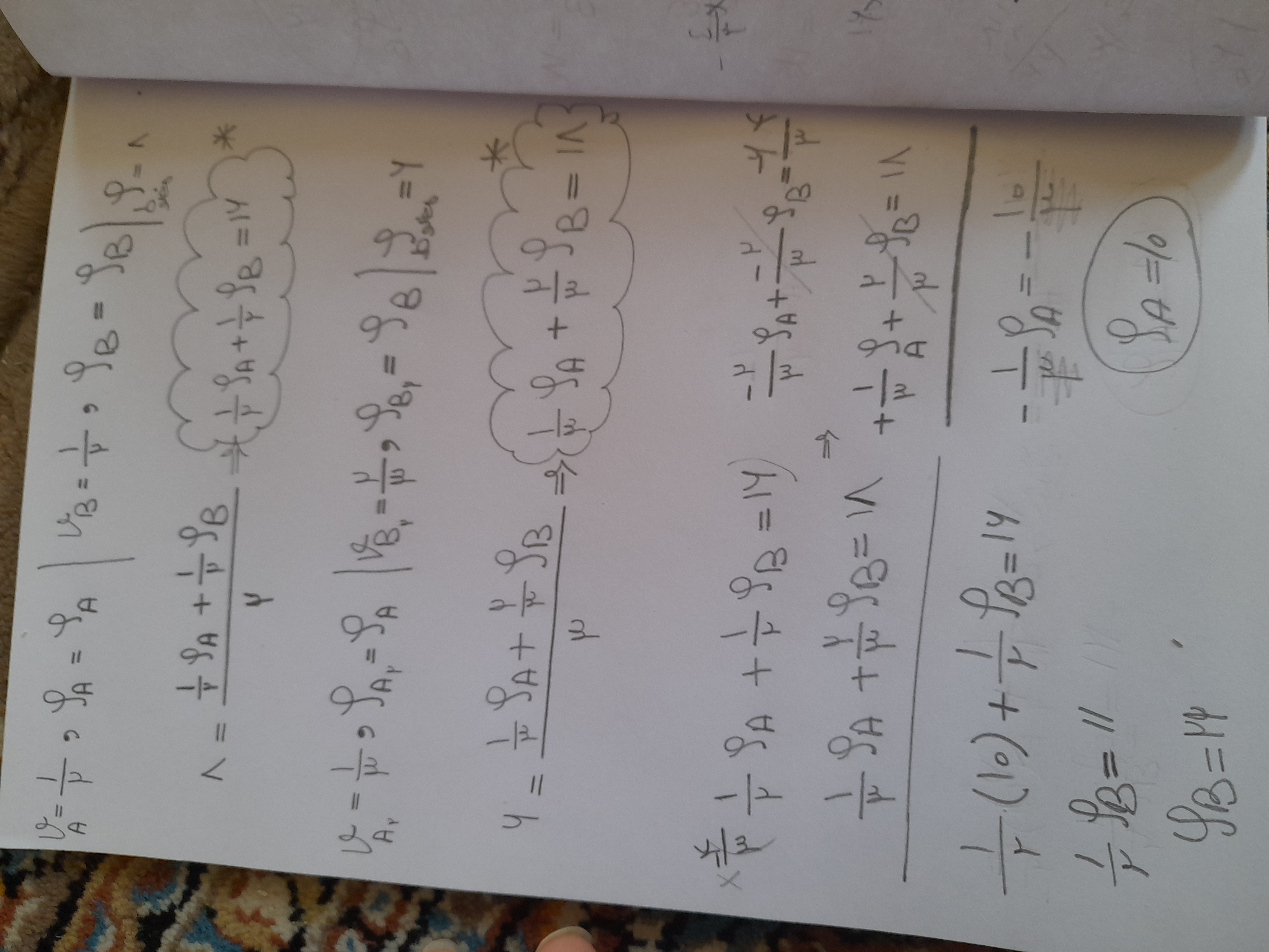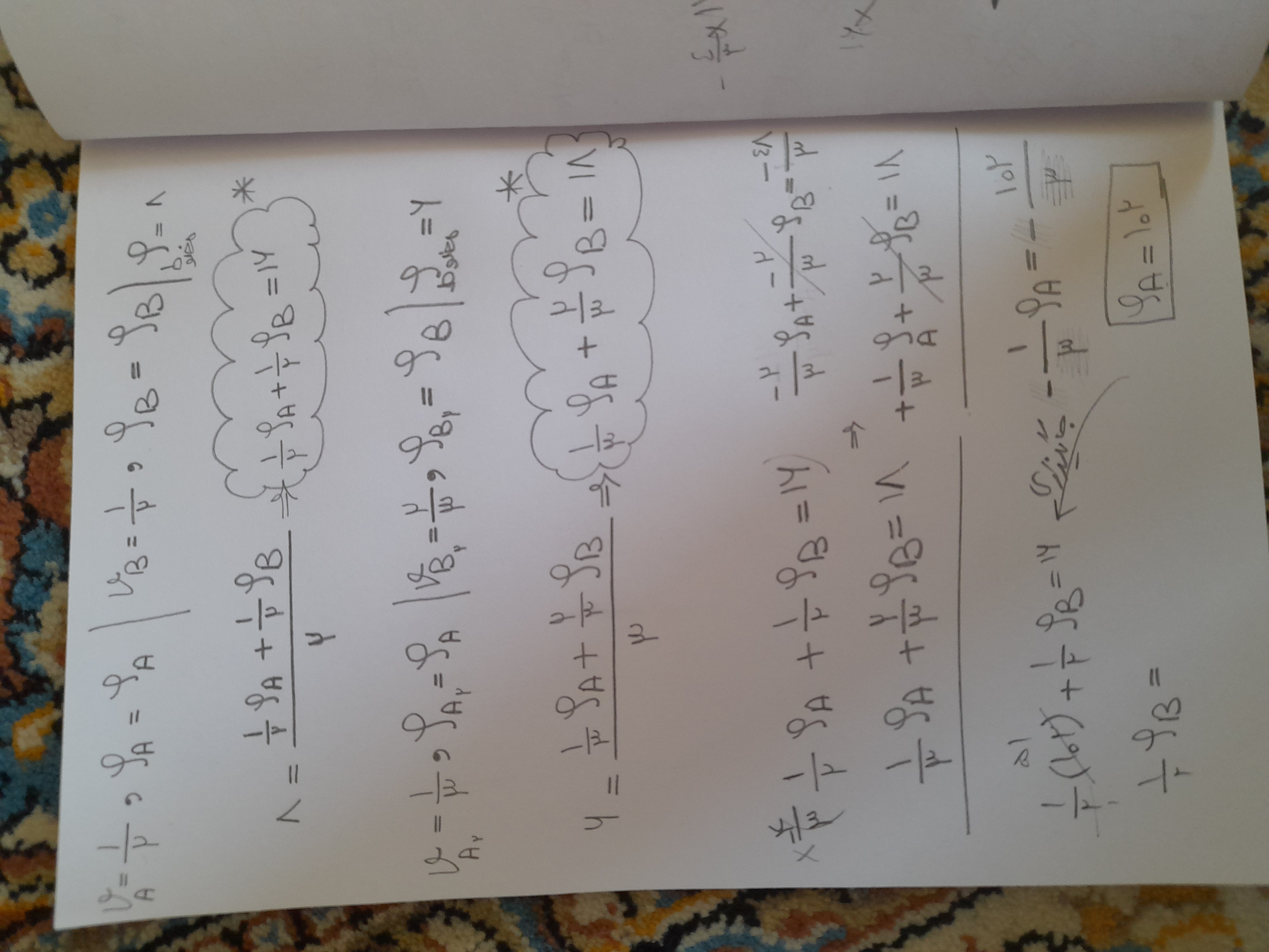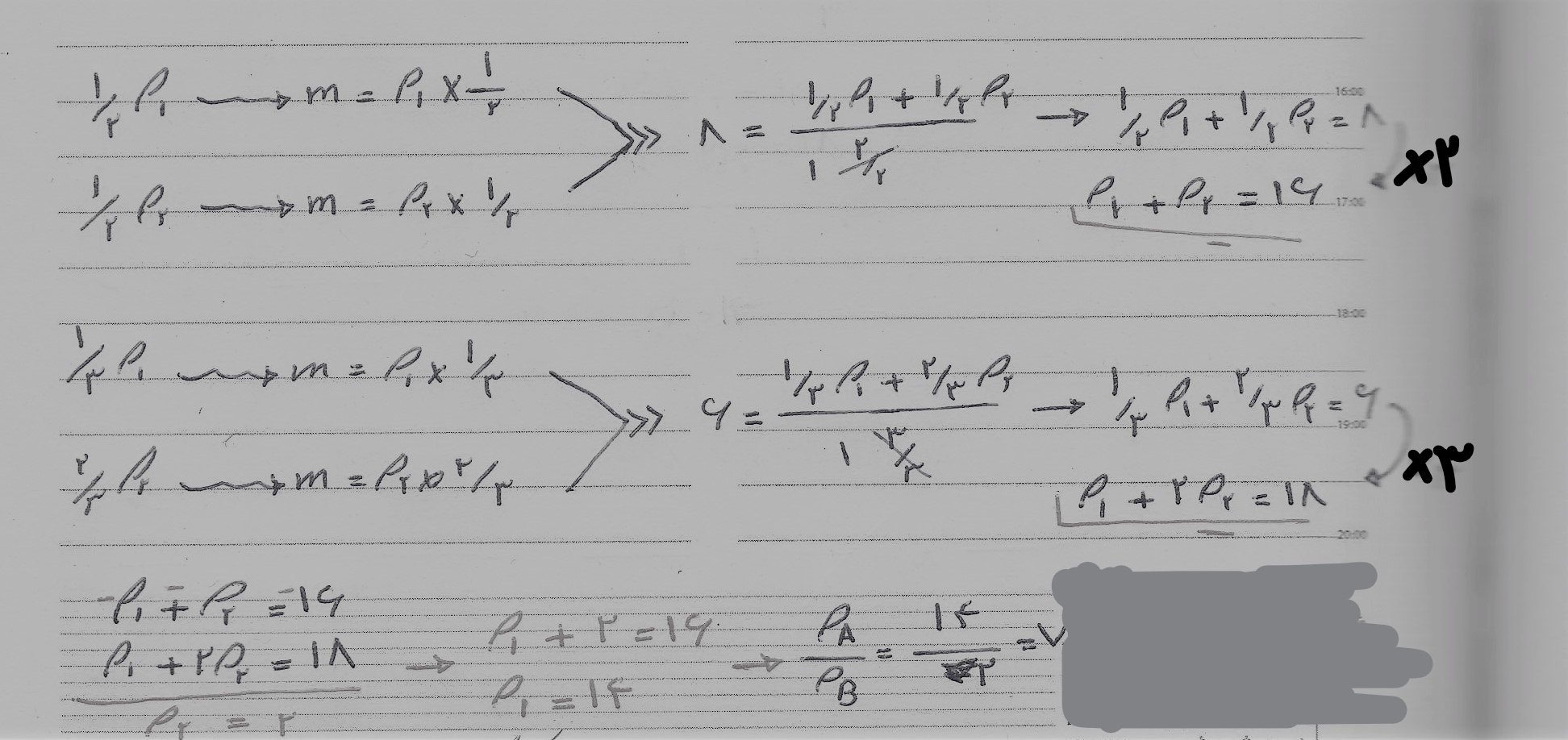 سلام روزتون بخیر:) زمانی که دو تا معادله داریم و دو مجهول، برای بدست اوردن مجهولات باید دستگاه حل کنیم. یکی از این روش ها اینه که یکی از مجهول هارو به طریقی از بین ببریم. مثلا در اینجا میایم یکی از معادله ها رو در یک منفی ضرب میکنیم و بعد دوتا معادله رو با هم جمع میکنیم. با اینکار یکی از مجهول هامون (ρA) از بین میره و به یک معادله با یک مجهول تبدیل میشه که اینطوری میتونیم خیلی راحت مجهولمون رو پیدا کنیم:)