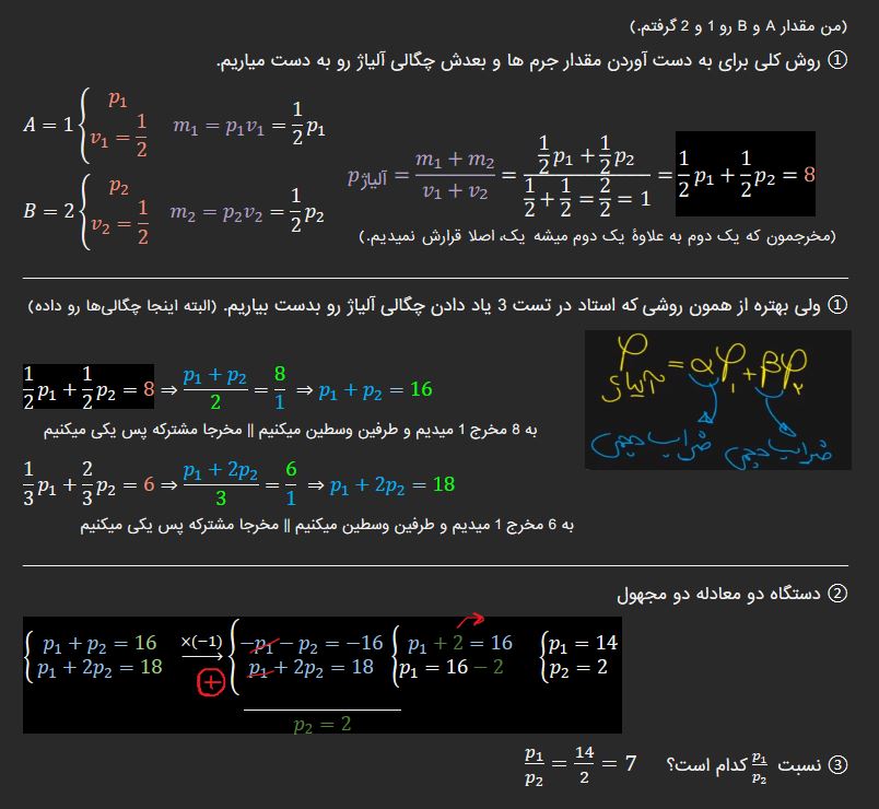 سلام نگاه کن این تست گفته یه نصف ظرف یه نوع مایعه نصف ظرفم یه نوع مایع دیگس برای حل همچنین سوالاتی که ضرایب جمعی دارن استاد یه فرمول معرفی کردن حالا اینجا به دوطریق مختلف ظرایب جمعی گزاشته که میشه دستگاه دومعادله دو مجهول ساخت با استفاده از اون فرمول و این سوال رو حل کرد